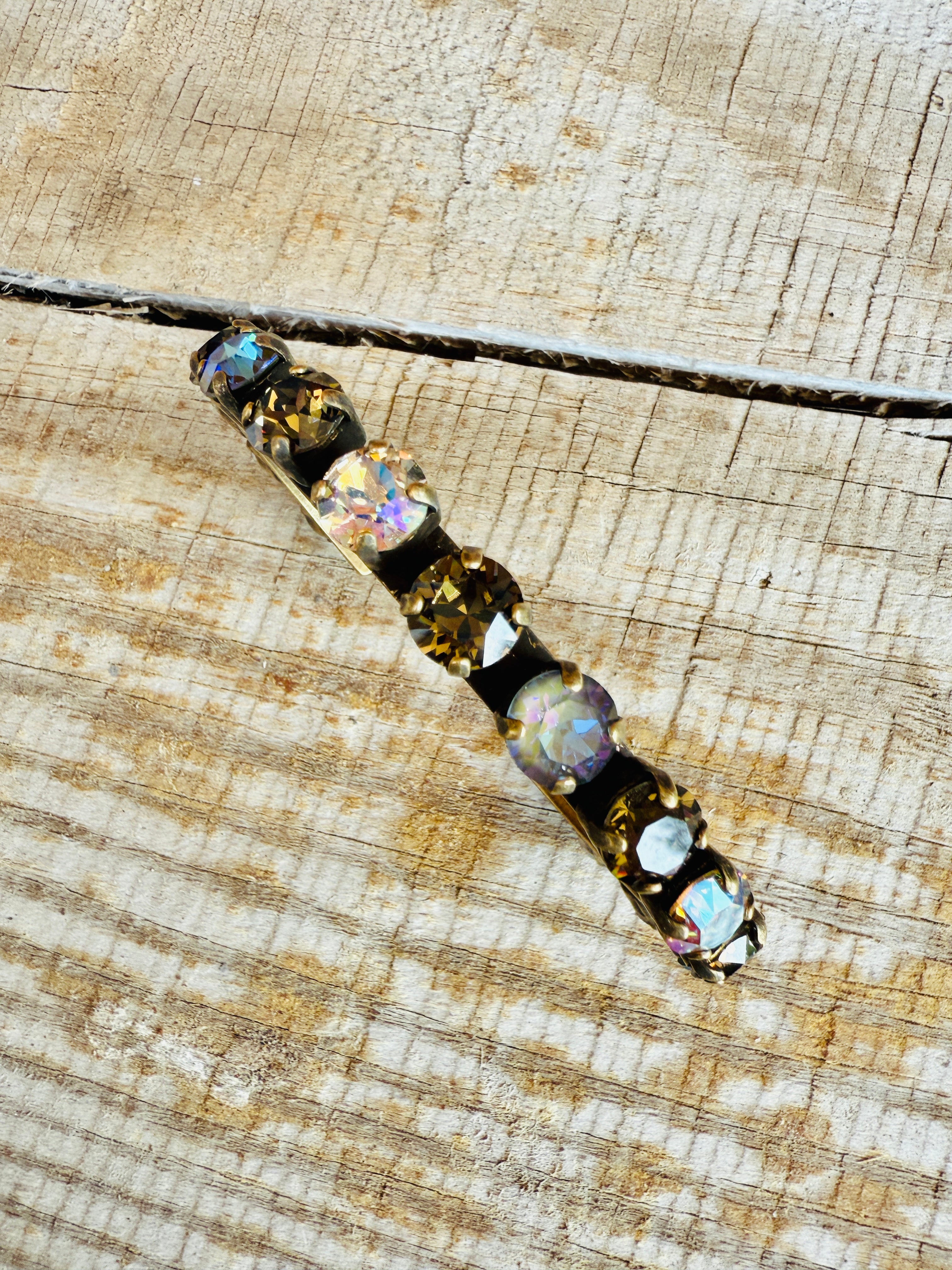 The Natasha brown Crystal Cuff Antique Gold Bracelet adds a pop of warm golden hues to your wrist. With its stunning shades of bronze. This bracelet style has a smidge of wiggle room to adjust to your perfect size, it's a chic and practical addition to your ensemble. The finish? Antique gold