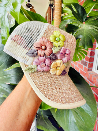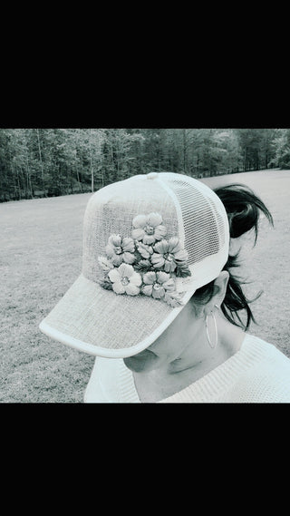 Elevate your fashion game with this adorable floral bejeweled bling two toned trucker hat. This beige, adjustable hat is ideal for your next unruly hair day. Showcasing a 3-D floral design with crystal studded embellishments.