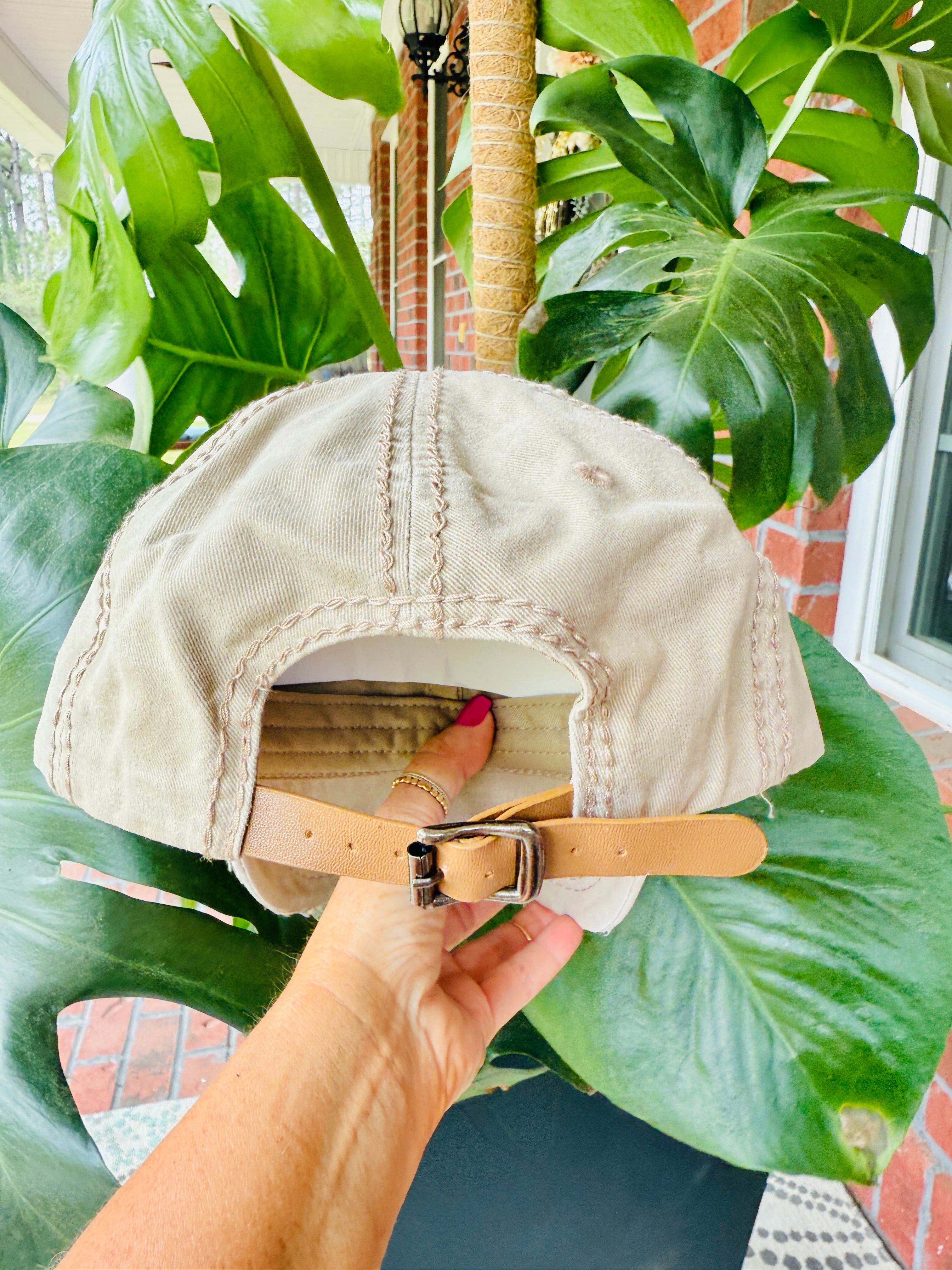 Belt style leather strap adjustable closure. Opening for ponytail.