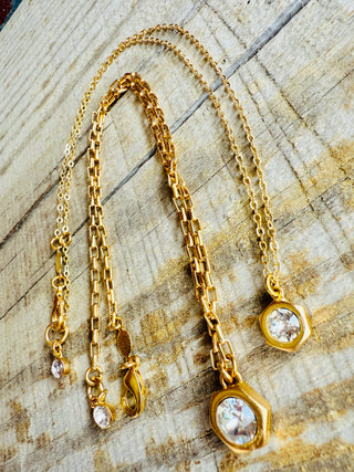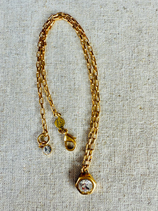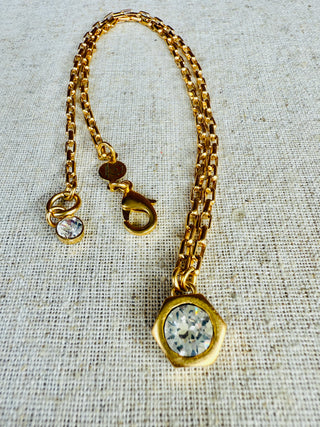 Meet Emmie's bis sister, Hallie. Unique hex nut setting encasing a clear Australian crystal (8mm) set in a modern matte gold. Adjustable length for your perfect style 16"-18". Complete with extender chain, crystal end charm, lobster clasp hook, and logo disc.