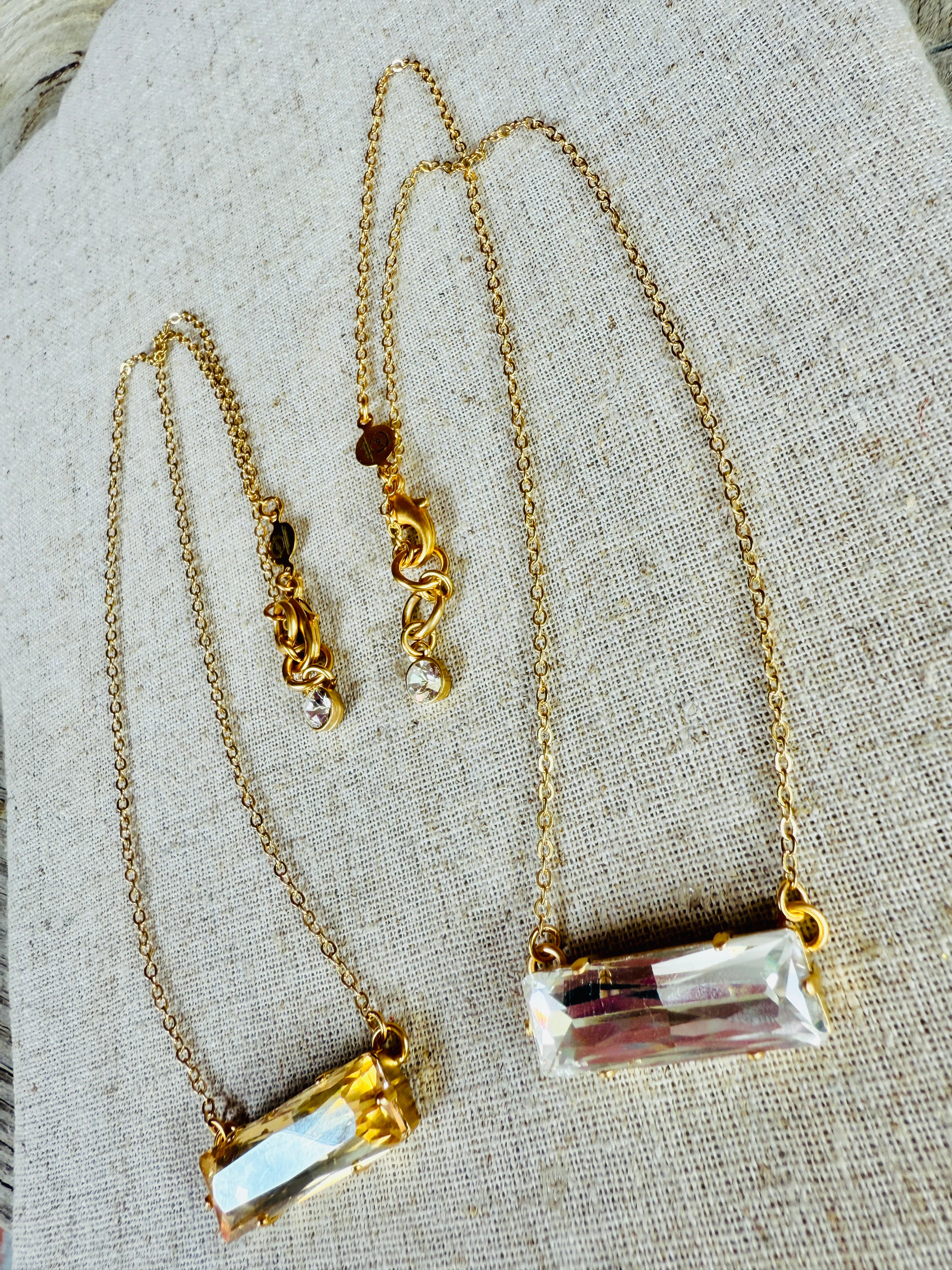 Add some sparkle to your outfit with our Madeline Crystal Bar Pendant Necklace. This sleek and stylish piece comes in your choice of crystal clear or gold, set in a modern matte gold. At 14.5 inches, it's the perfect length for any occasion. Complete with extender chain, crystal end charm, lobster clasp hook, and logo disc.