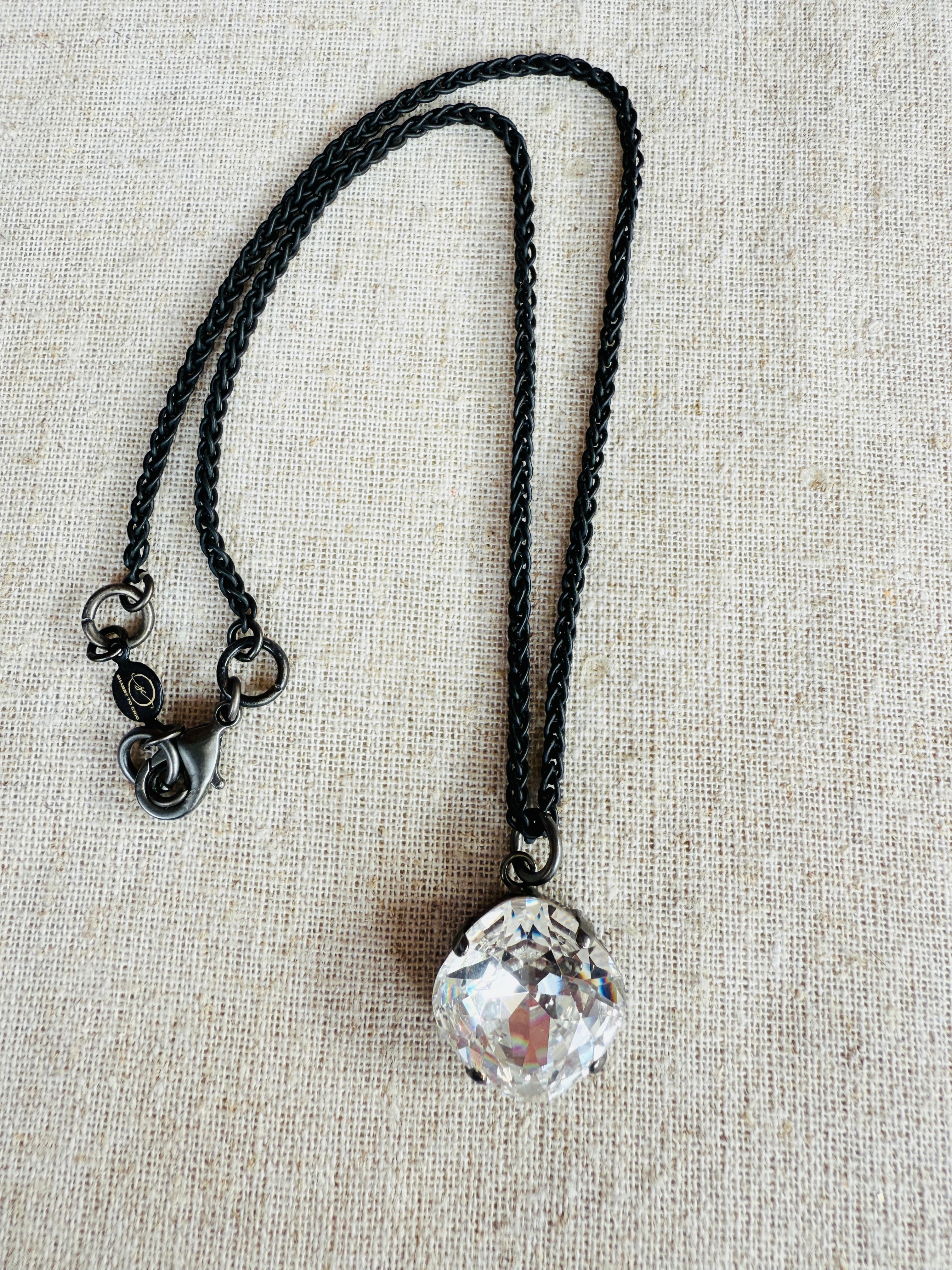 Introducing Joanna (add a little "spice") a pendant necklace with a bold edge! Featuring a soft square crystal (18mm), set in chic matte black with matching wheat style chain. Adjustable length from 16" to 18".