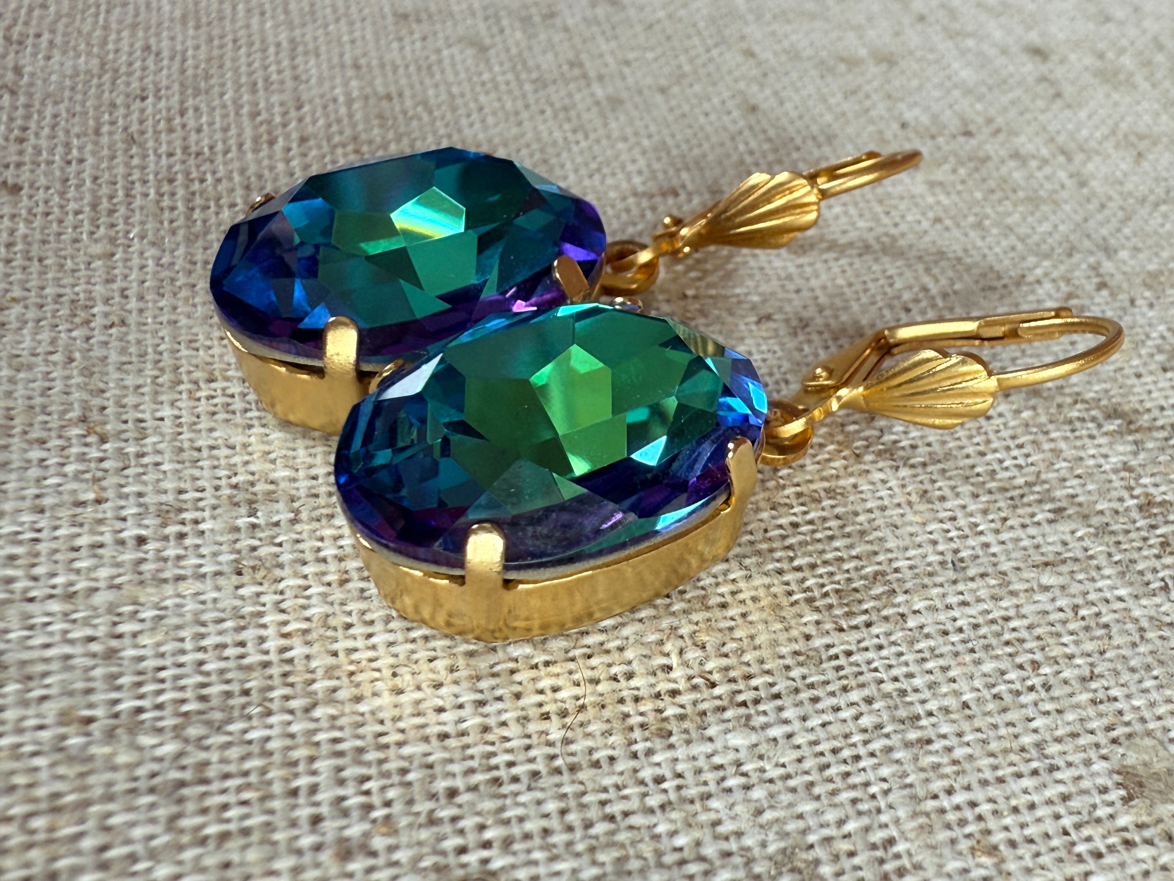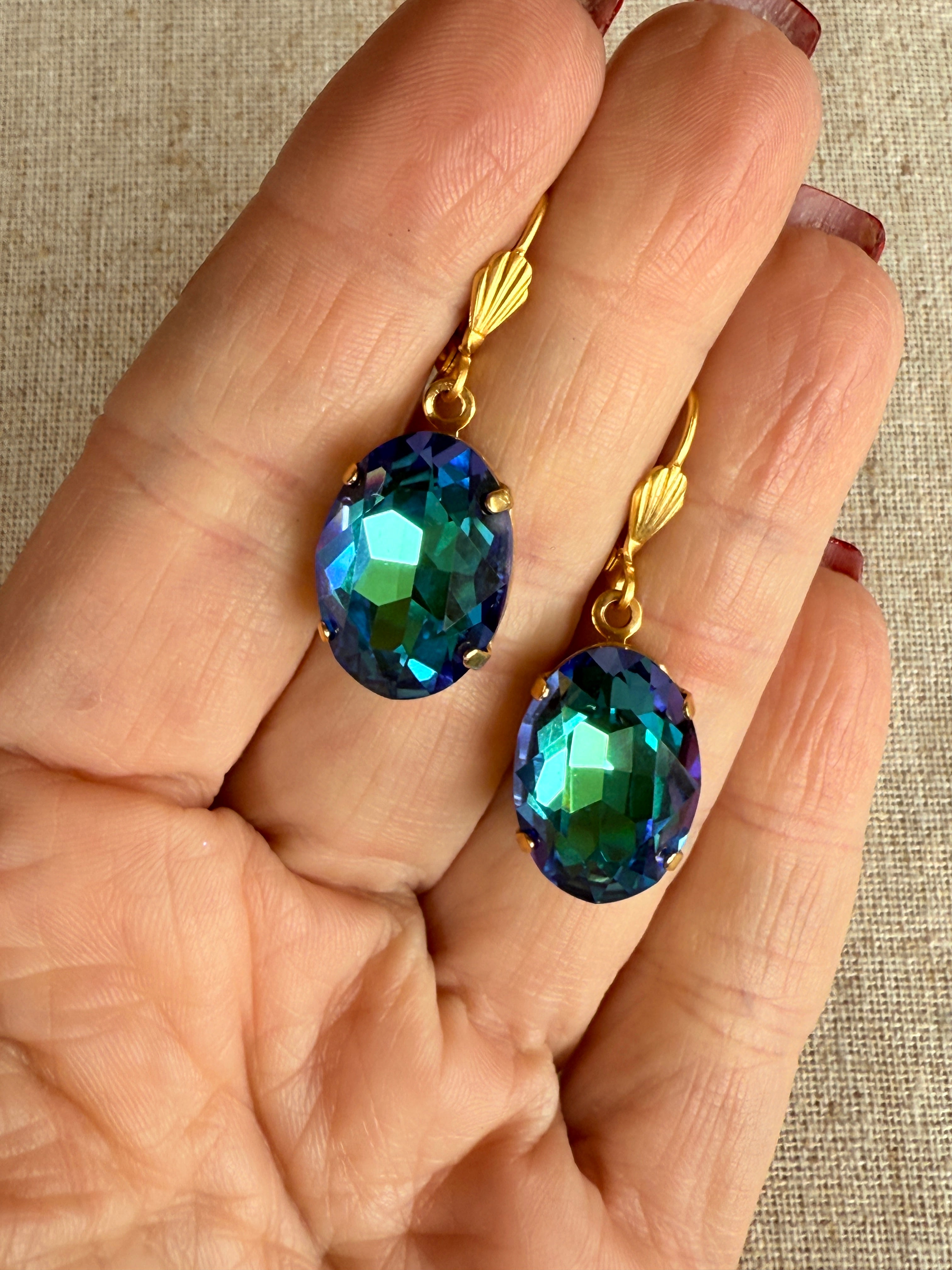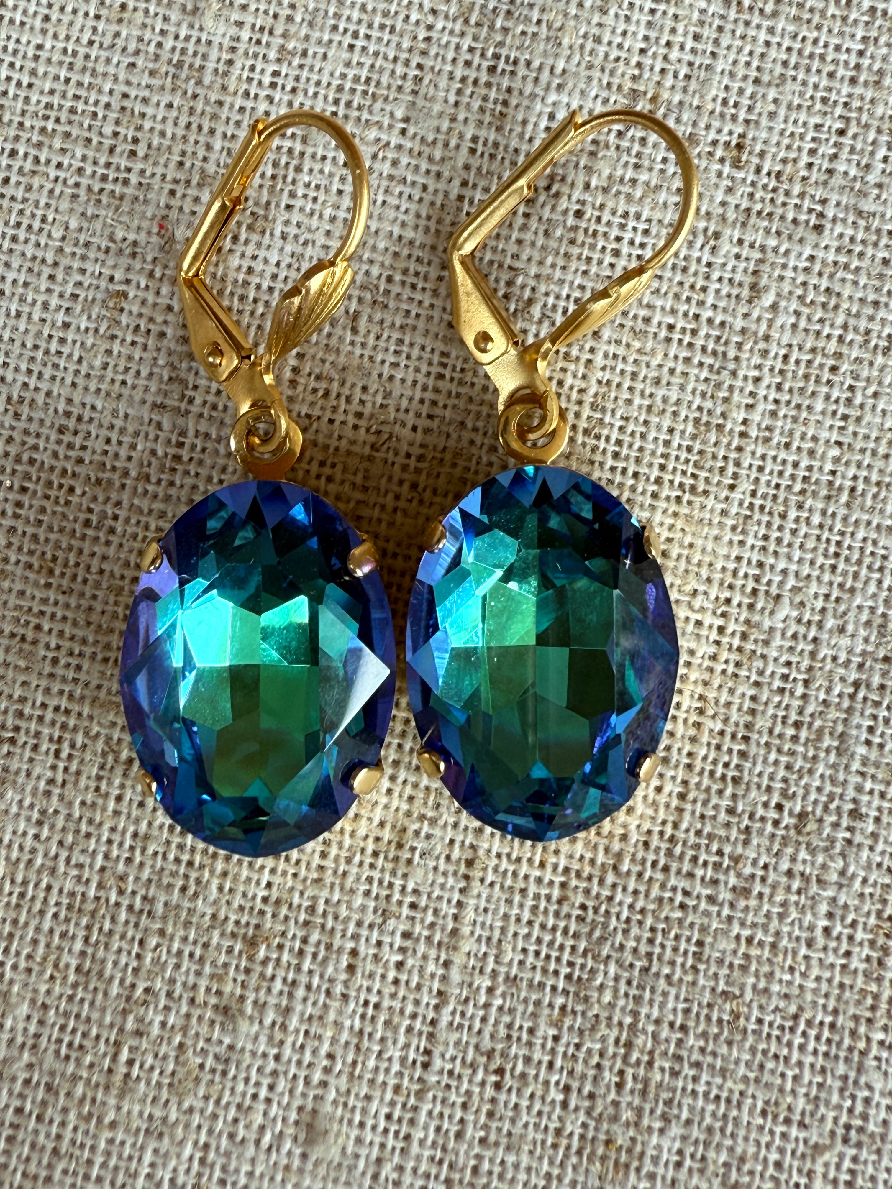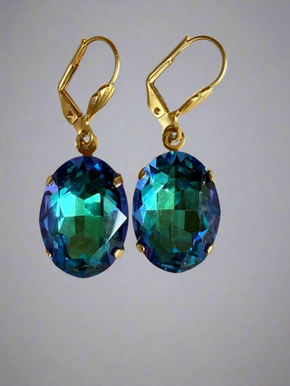 Indulge in the beauty of these Oval Cut Crystal Dangle Earrings, featuring a stunning set of shimmering faceted crystals arranged in a spectrum of blues and greens. The glamorous matte gold and lightweight design, along with the lead and nickel-free materials, make these earrings the perfect choice. With a secure lever back closure, you can confidently dance the night away.