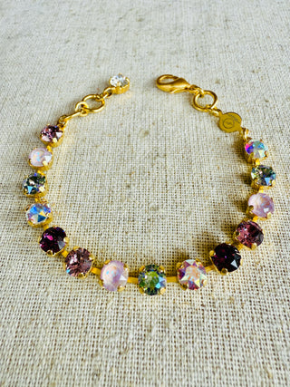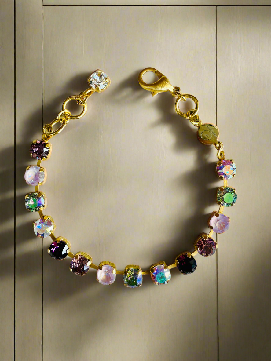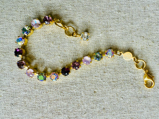 Get ready for some serious style with Carlie's Amethyst Crystal Tennis Bracelet! Purple crystals in varying shades perfectly align to elevate your summer wardrobe. Crafted with high quality Australian crystal (6mm), this bracelet features a matte gold finish, adjustable sizing from 7" to 7.5", a stunning crystal end charm, a lobster clasp closure, and a logo disc. Plus, the extender chain allows for custom sizing to suit your unique style. Don't miss out on this must-have accessory!