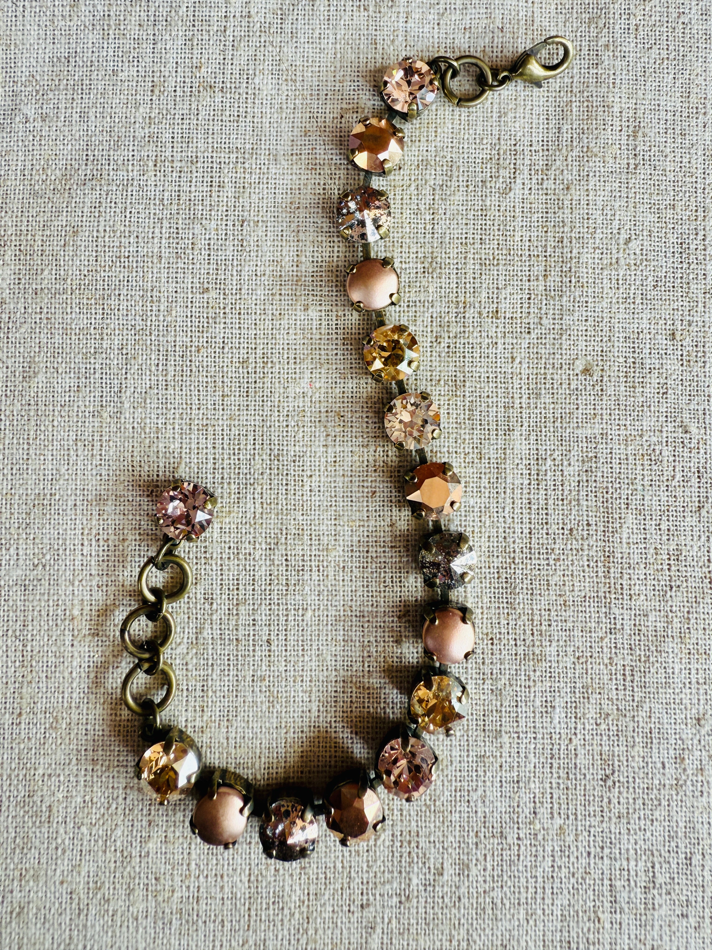 Experience the radiant beauty of Eliza Rose Gold Tennis Crystal Bracelet featuring warm shades of Australian crystals in antique gold finish. With a crystal tennis bracelet measuring 7" to 7.5", you can comfortably wear it all day, and it even comes with an extender chain, logo disc, lobster clasp claw, and crystal end charm.
