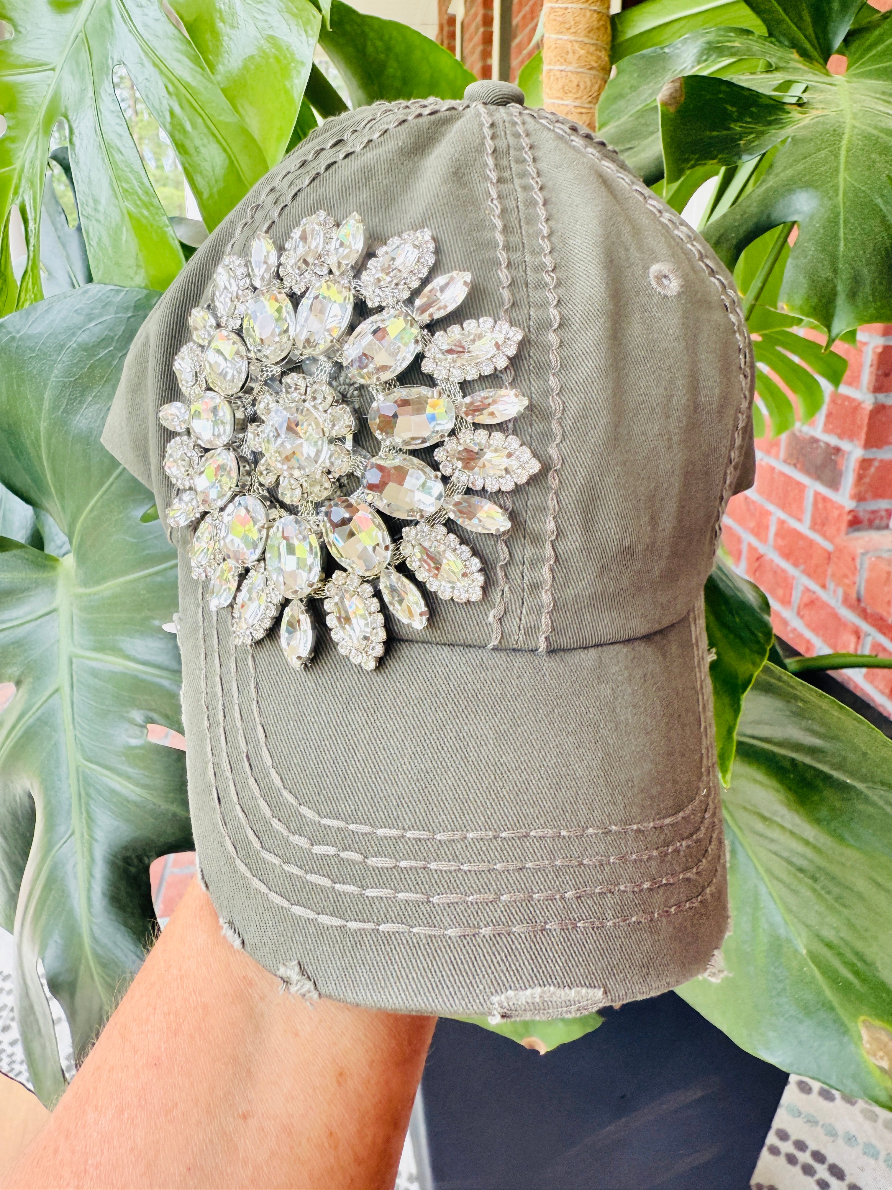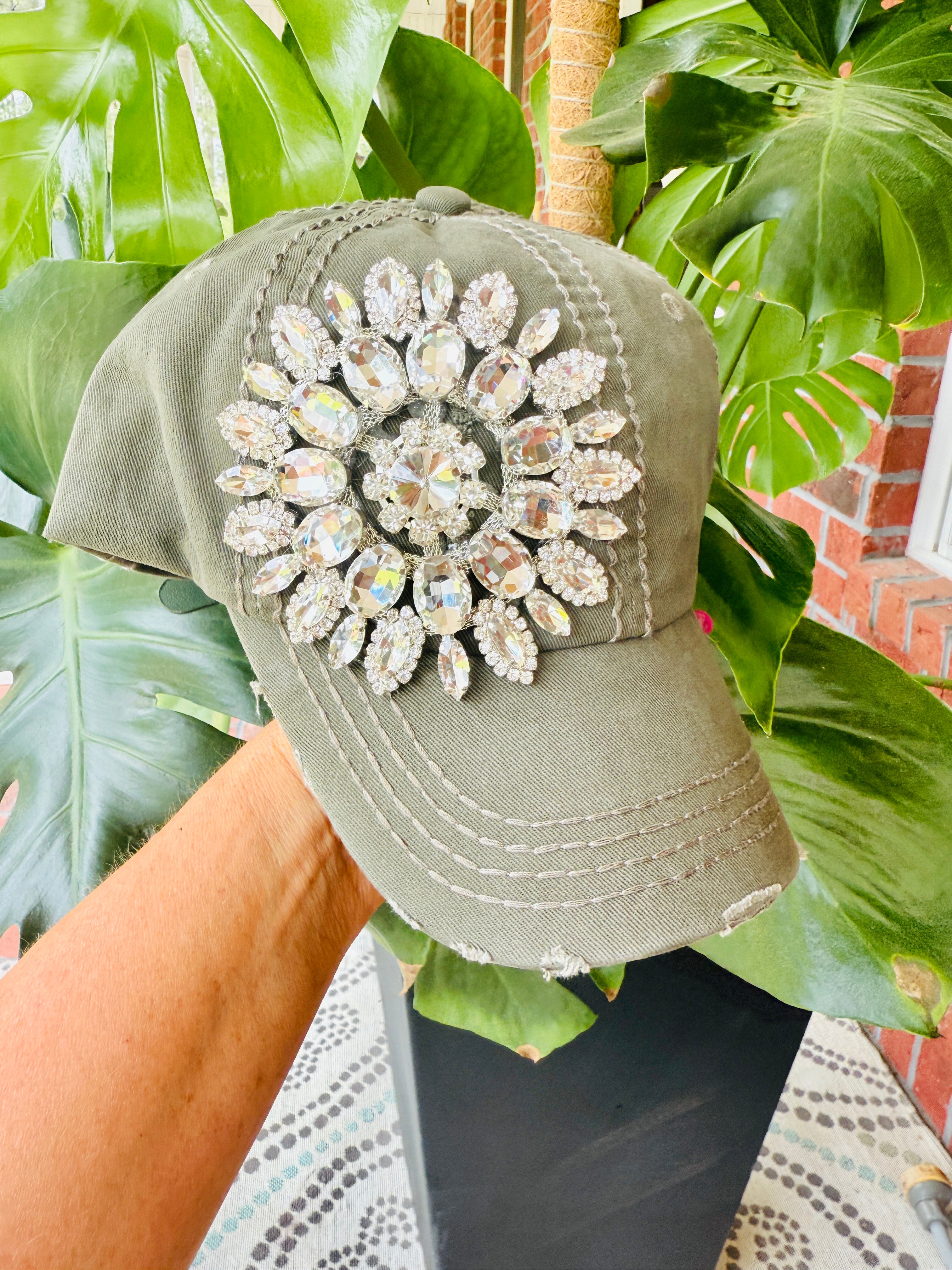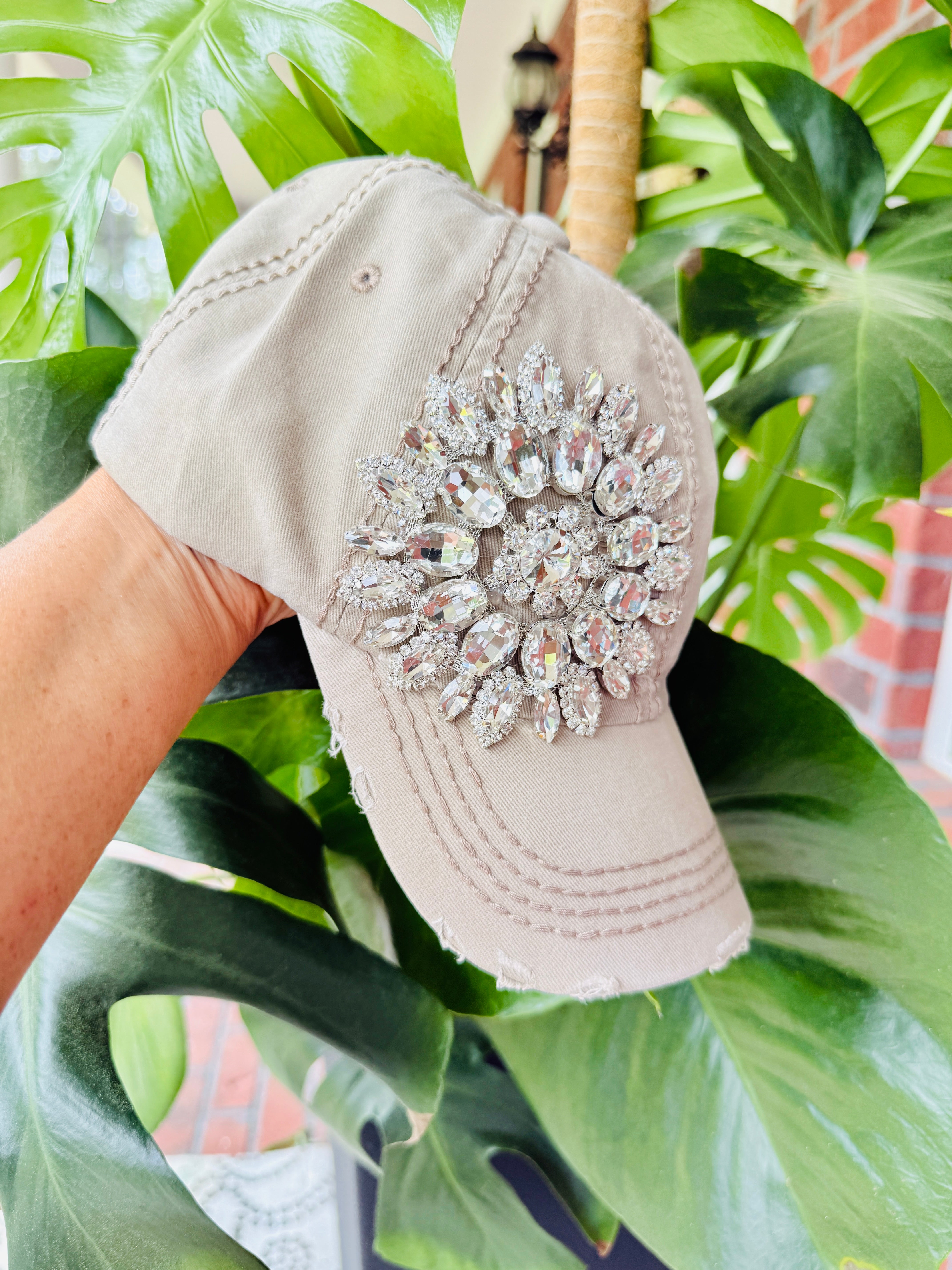 Cotton twill blend. Complete with perfectly placed sunburst pattern of crystals to accessorize any outfit. Khaki cotton twill material, and clear crystal rhinestones.