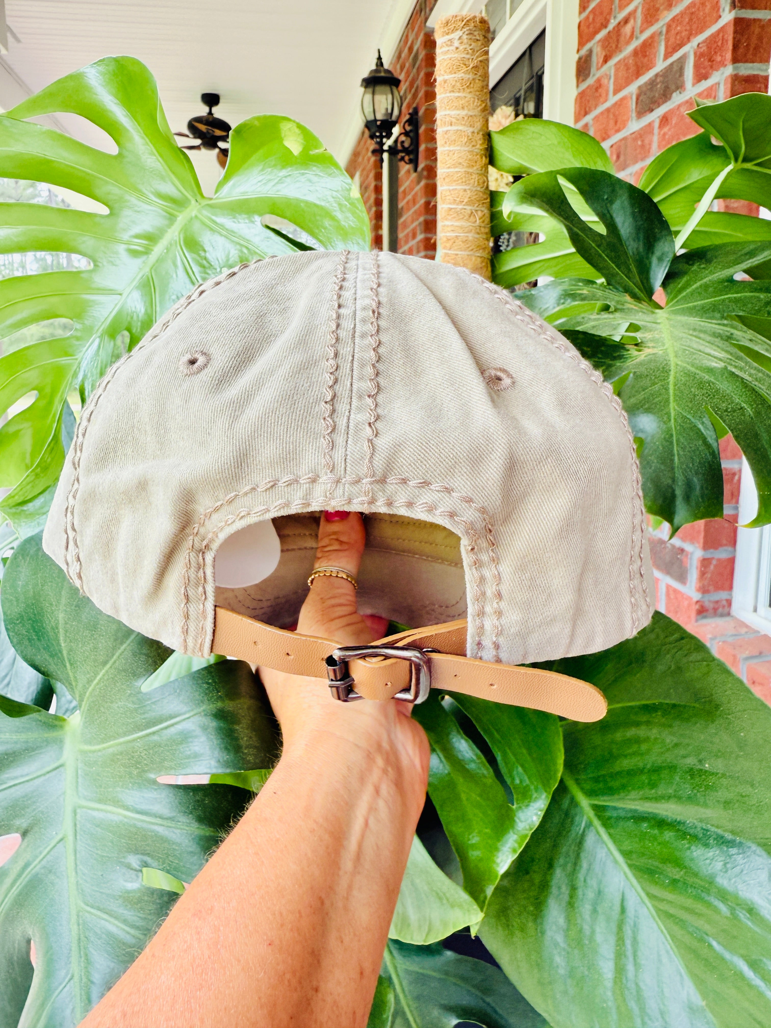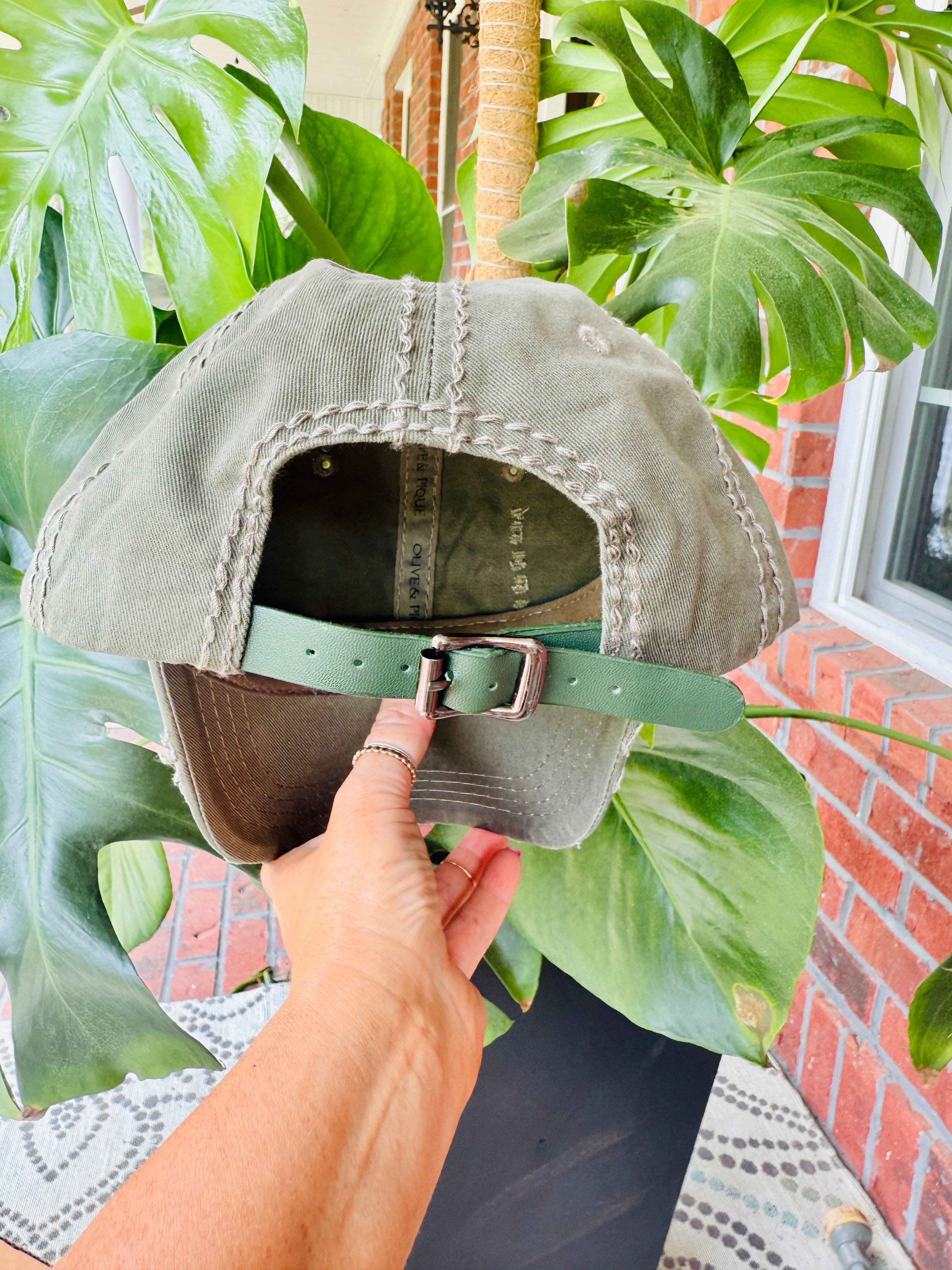 Belt style leather strap adjustable closure. Opening for ponytail.