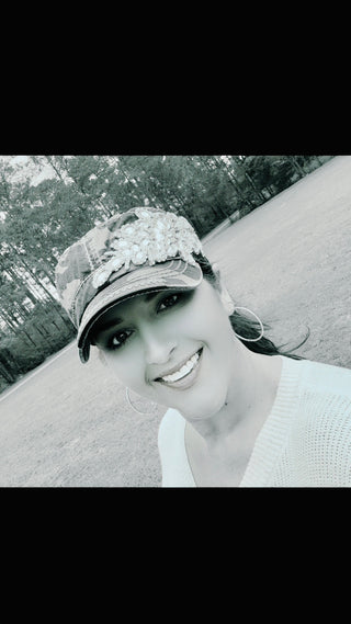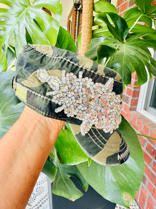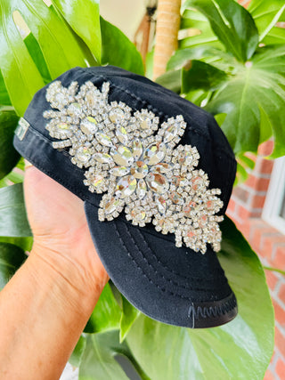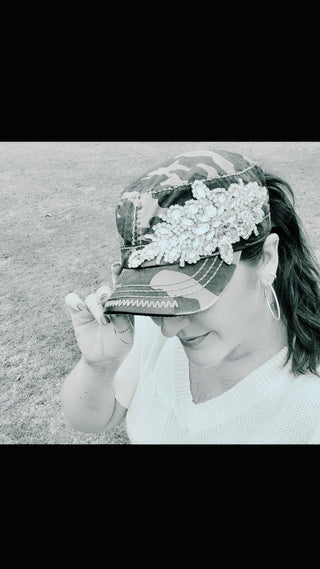 Available in black and camouflage. Cotton twill blend. Complete with perfectly placed crystals to accessorize any outfit. Cotton twill material and clear crystal rhinestones spread in a lacy pattern that extends over the right ear and stretches toward the right temple