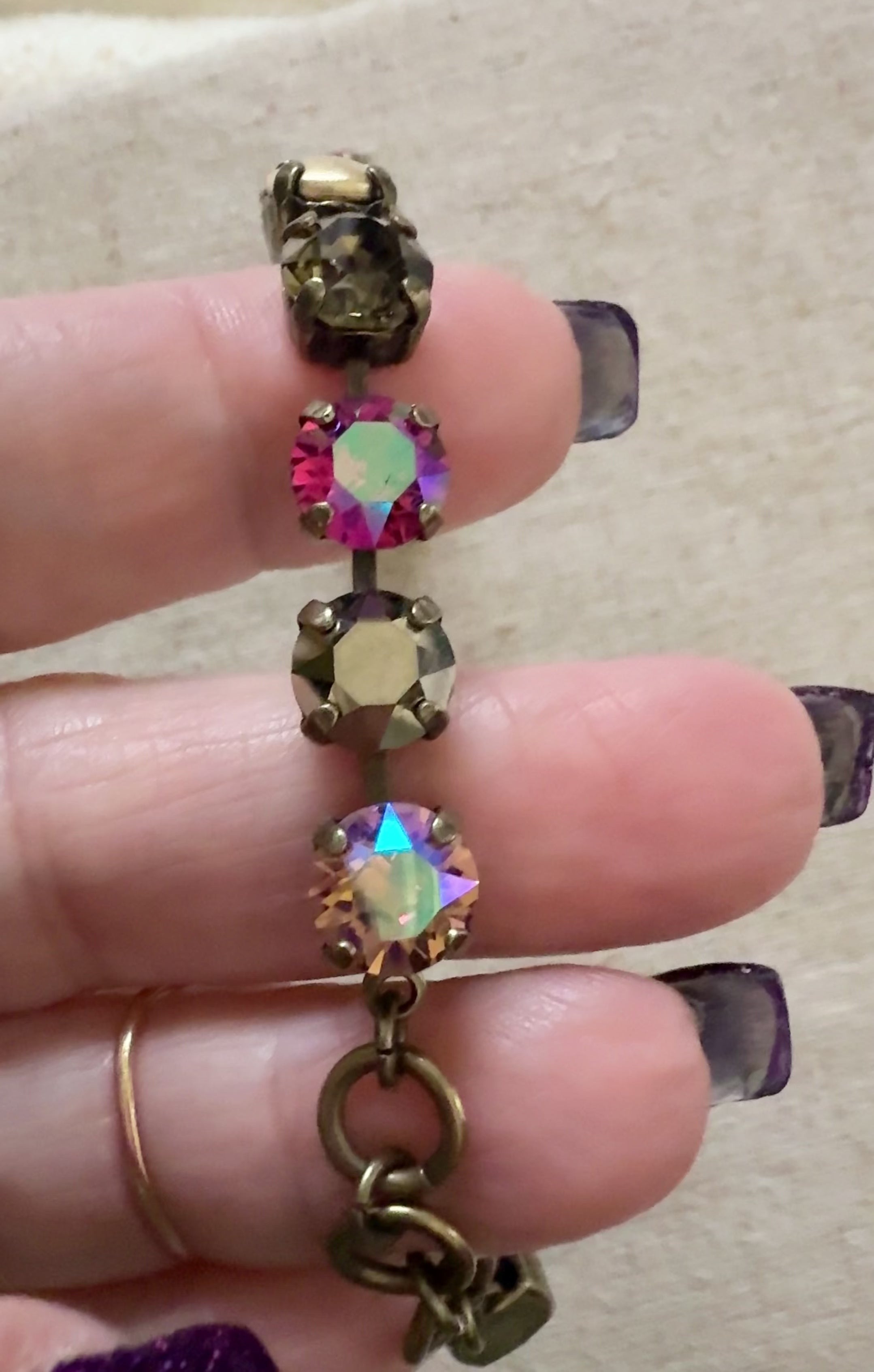 The Amber bracelet has an antique gold setting, with alternating hues of golds, bronze, olive green, and fuchsia. Bracelet is adjustable between 7" and 8".