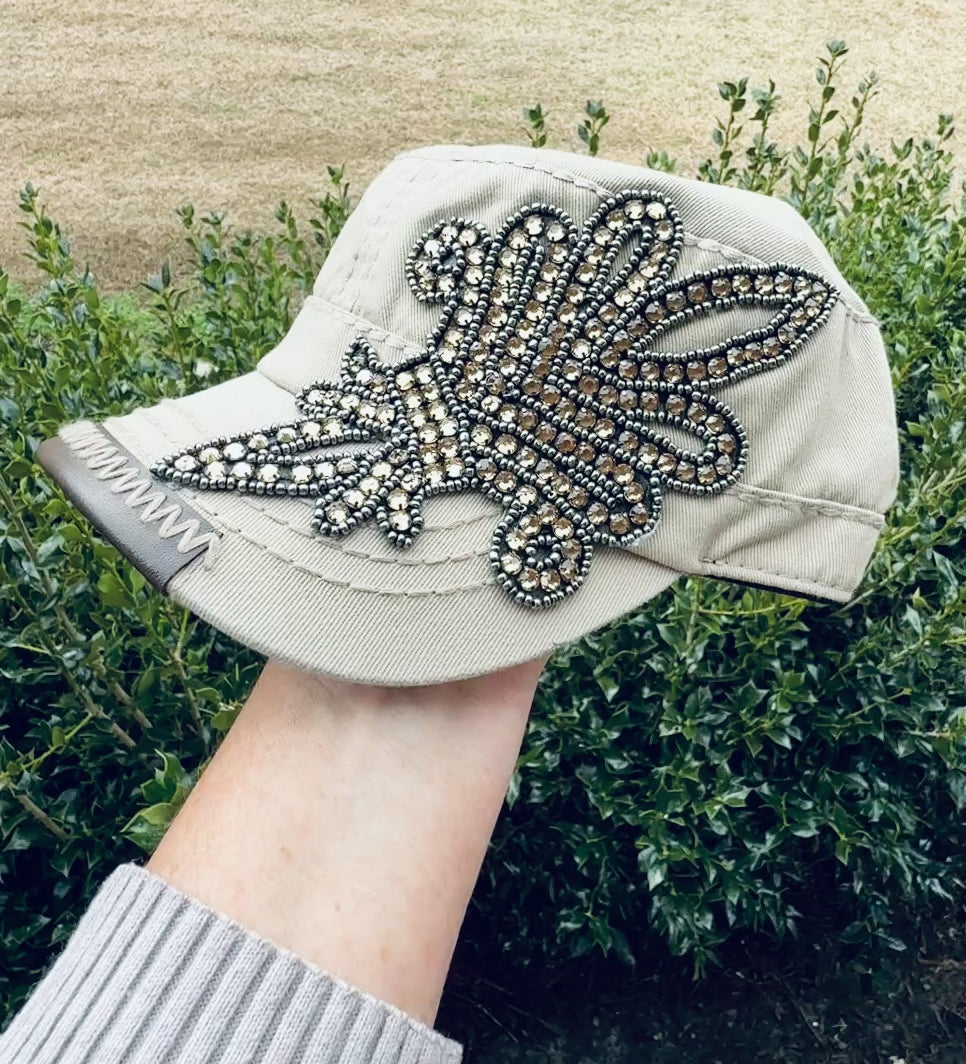The Olive and Pique Crystal cadet style hat features a beige canvas cloth material and an adjustable velcro belt style closure. This hat also has an opening for ponytails and is adorned with bronze crystals in a fluer de lis pattern trimmed in seed beads for exquisite detail. The crystals stretch from the left ear, over the temple area, to the forehead. Additionally, the fabric is lightweight and breathable for comfortable all-day wear.