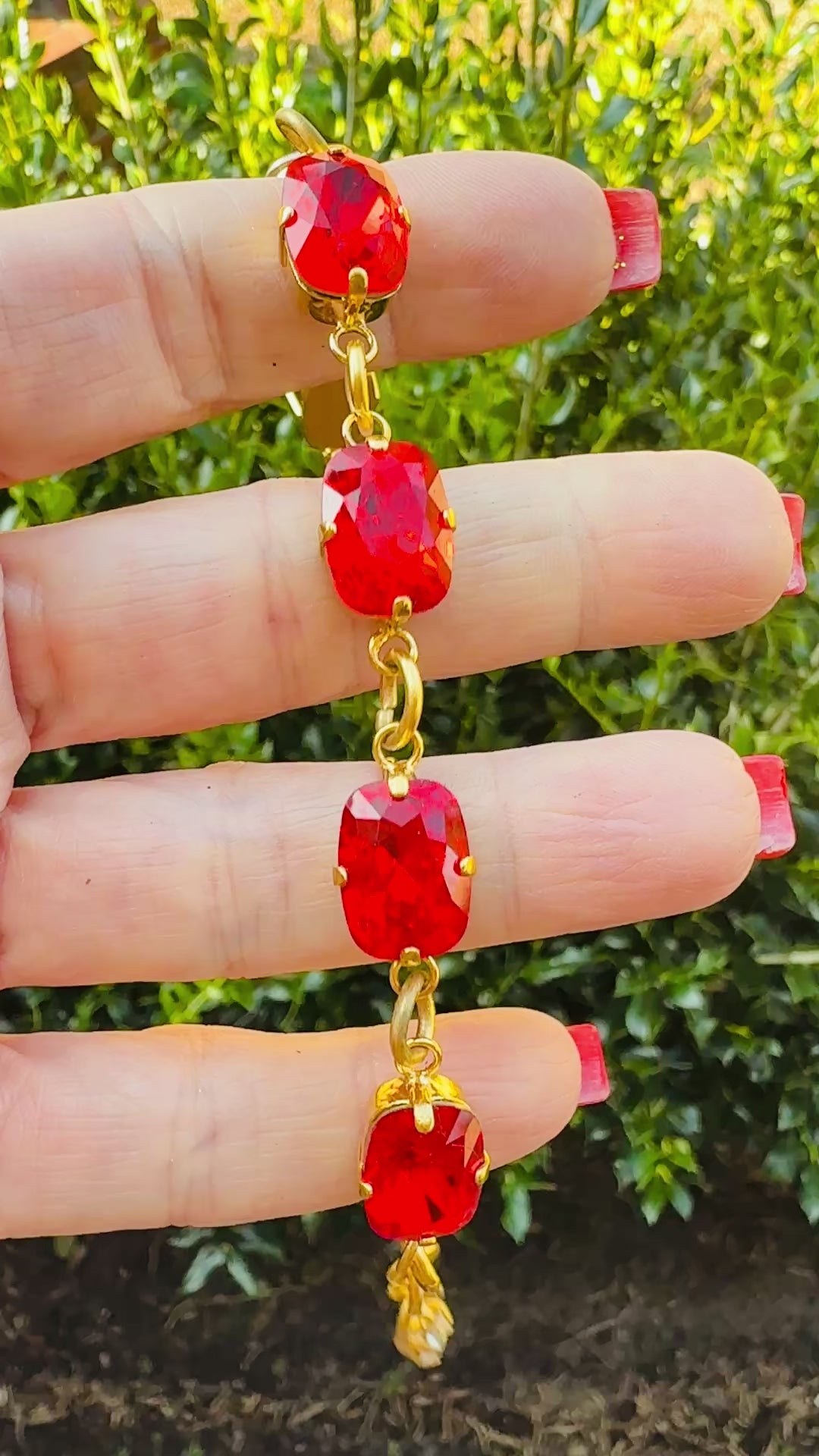 Featuring six faceted cushion cut crystals in a mesmerizing shade of red, this bracelet boasts adjustable sizing, a secure lobster clasp closure, and a gold tone finish. The extender chain adds versatility, accented by a dazzling crystal charm.