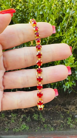 The Clara crystal tennis bracelet embodies a minimalist style while maximizing shine with 19 (5mm) high quality crystals precisely aligned for optimal sparkle. It features a matte gold finish, a lobster claw clasp, a logo disc, a crystal end charm, and adjustable sizing for a perfect fit. Want to see a different color? Send us a message.