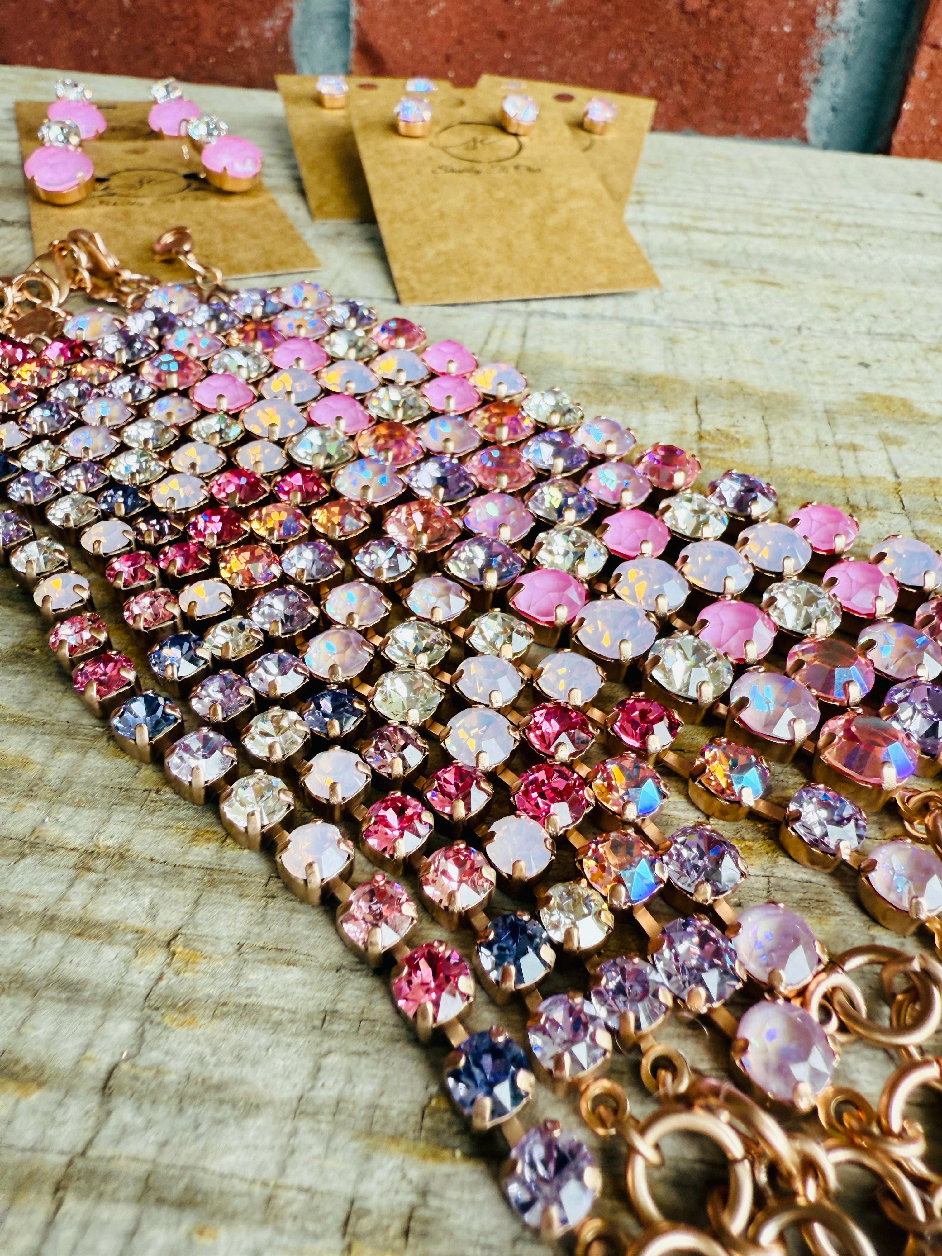 Elevate your wrist with the Ashtyn Crystal Tennis Bracelet, boasting a luxurious matte rose gold finish. This exquisite piece features premium Australian crystals in an enchanting fusion of blush and lilac tones that radiate feminine charm and dazzling brilliance. Designed with convenience in mind, the secure lobster claw clasp and extender chain offer a customizable fit ranging from 7"-7.5", while the elegant crystal end charm delivers that perfect finishing touch of sophistication you won't want to be without.