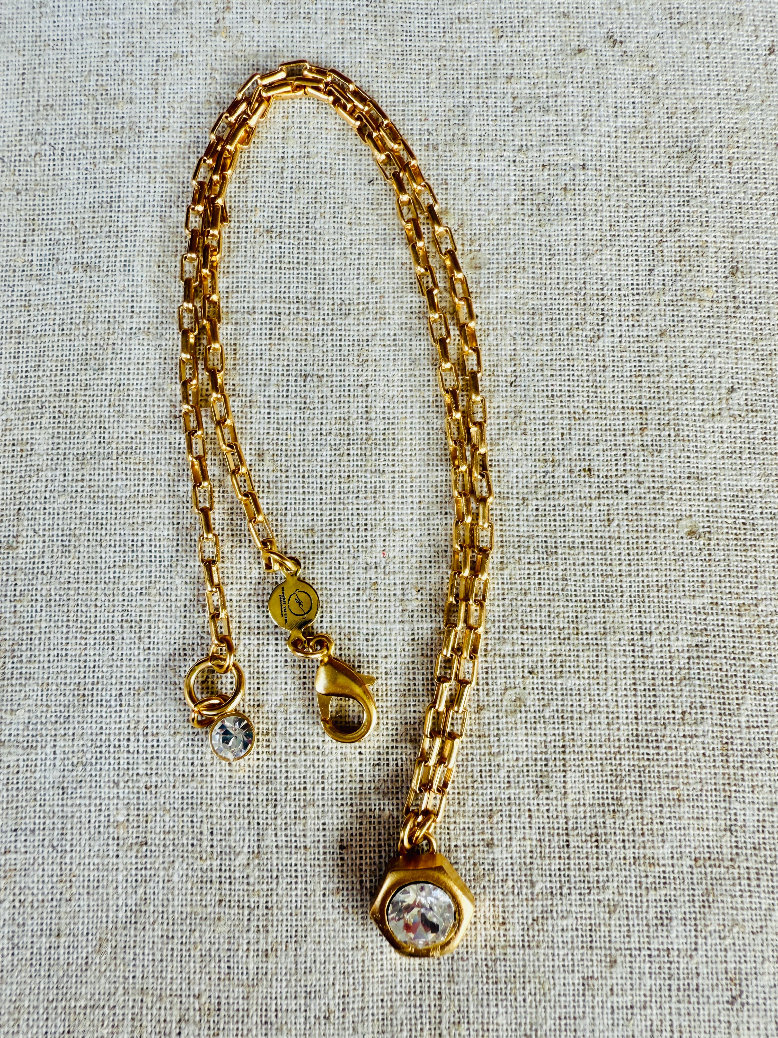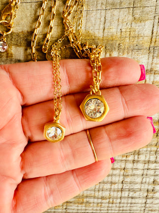 Meet Emmie's bis sister, Hallie. Unique hex nut setting encasing a clear Australian crystal (8mm) set in a modern matte gold. Adjustable length for your perfect style 16"-18". Complete with extender chain, crystal end charm, lobster clasp hook, and logo disc.