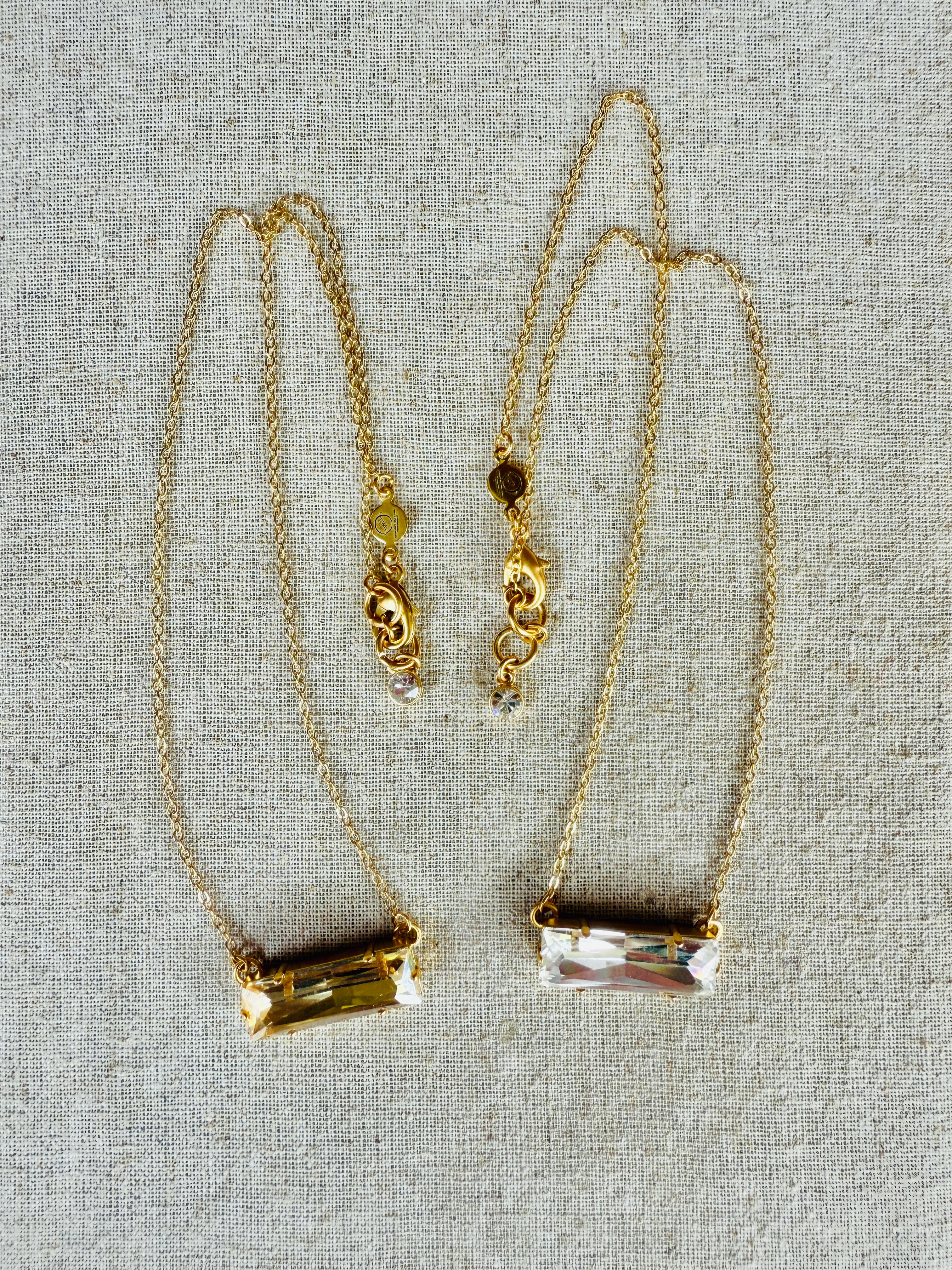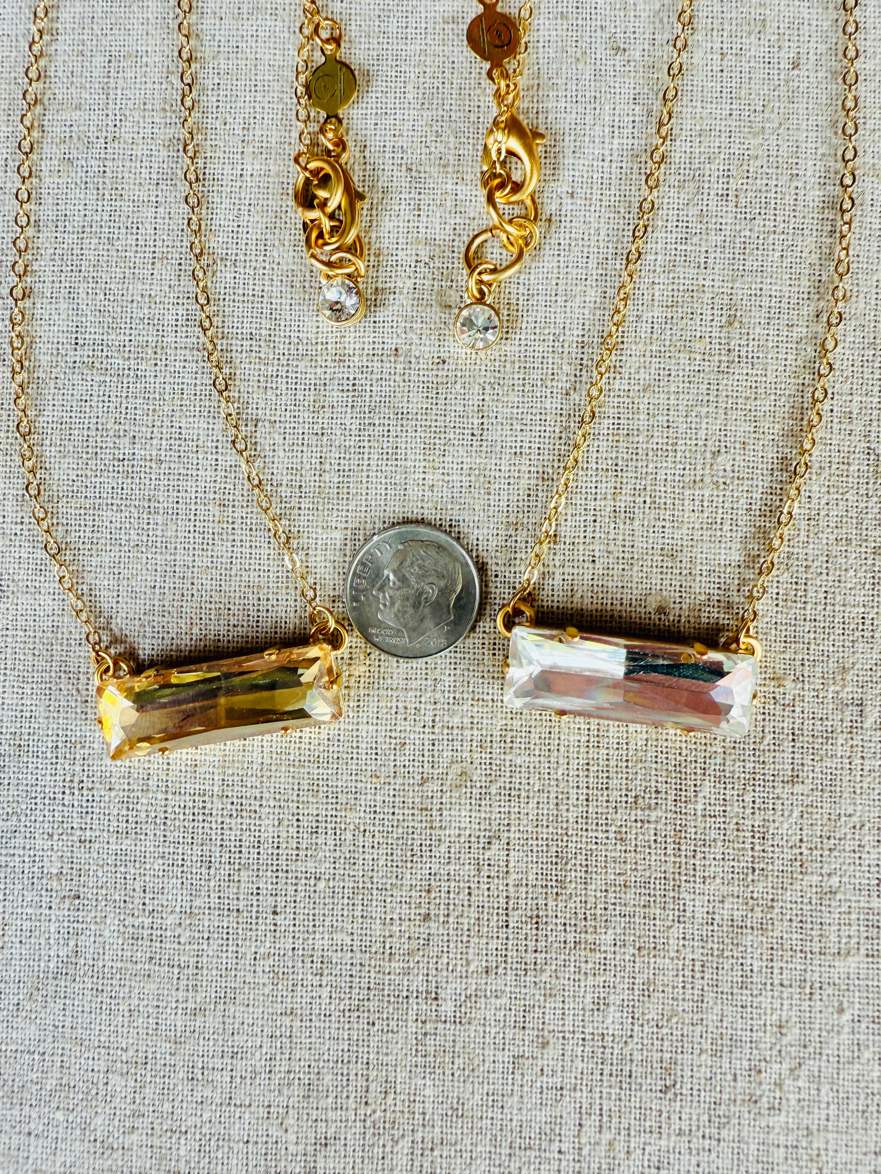 Add some sparkle to your outfit with our Madeline Crystal Bar Pendant Necklace. This sleek and stylish piece comes in your choice of crystal clear or gold, set in a modern matte gold. At 14.5 inches, it's the perfect length for any occasion. Complete with extender chain, crystal end charm, lobster clasp hook, and logo disc.