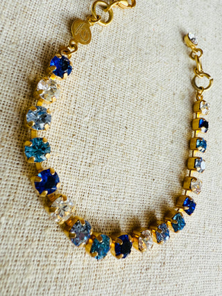 Avery is every shade of blue your heart desires, set in a gold finish. Highest quality Australian crystals, 5mm size. Adjustable sizing between 7"-7.5", extender chain, logo disc, lobster clasp closure, and crystal end charm.