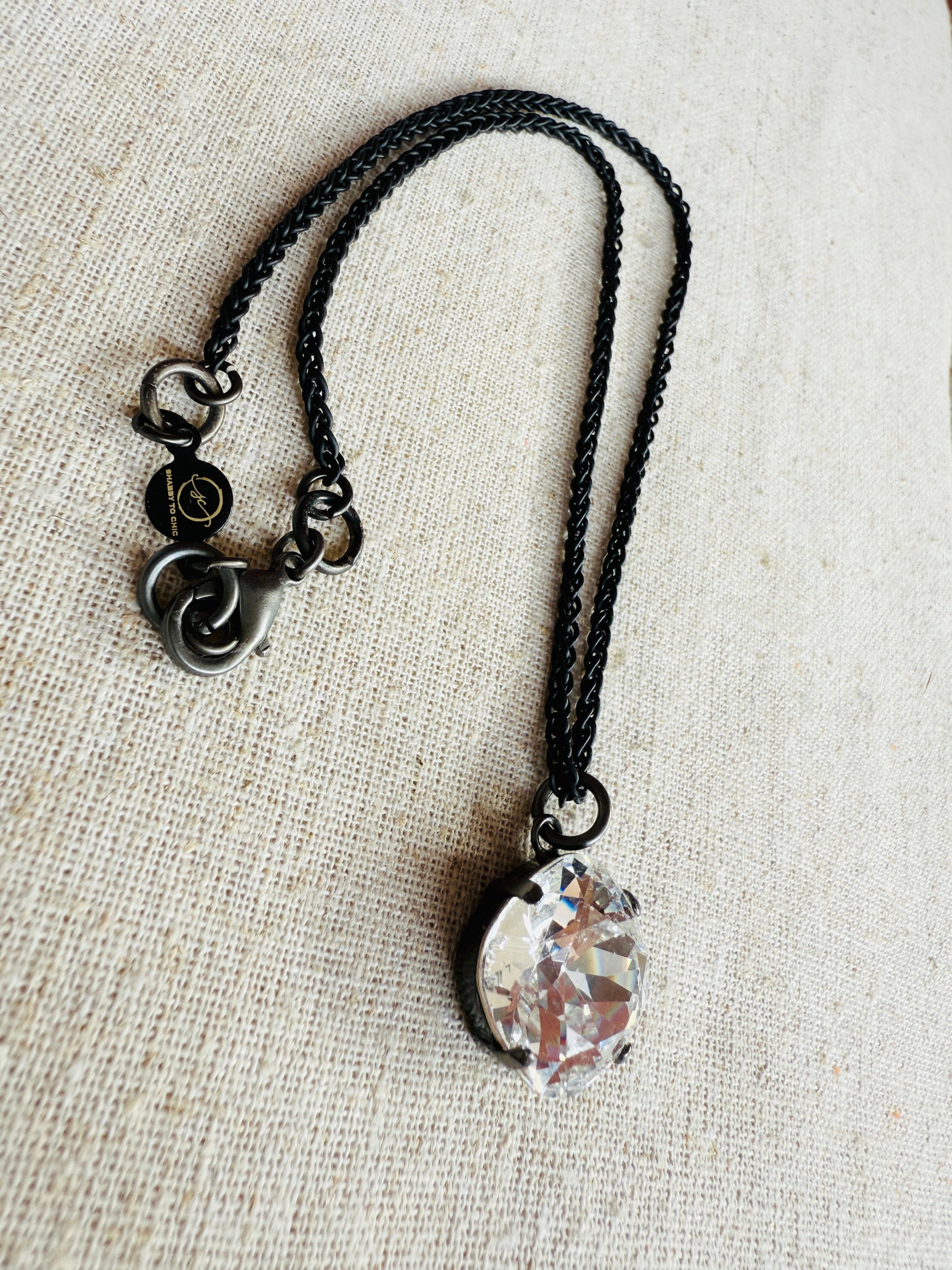 Introducing Joanna (add a little "spice") a pendant necklace with a bold edge! Featuring a soft square crystal (18mm), set in chic matte black with matching wheat style chain. Adjustable length from 16" to 18".