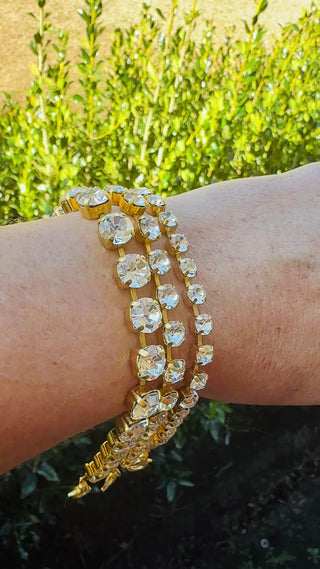 Crystal clear crystal perfectly aligned in a tennis bracelet that is fit for a queen! Set in the richest gold finish. This beauty is available in 3 different sizes (see pictures for reference)