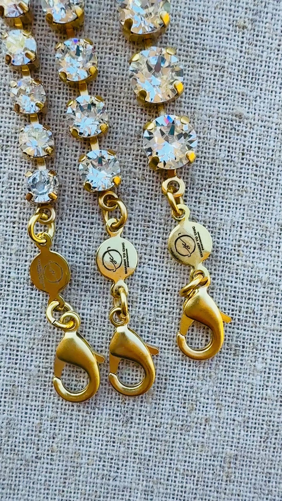 Complete with lobster claw clasp, logo disc, crystal end charm, and extender chain for custom sizing.