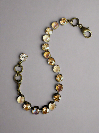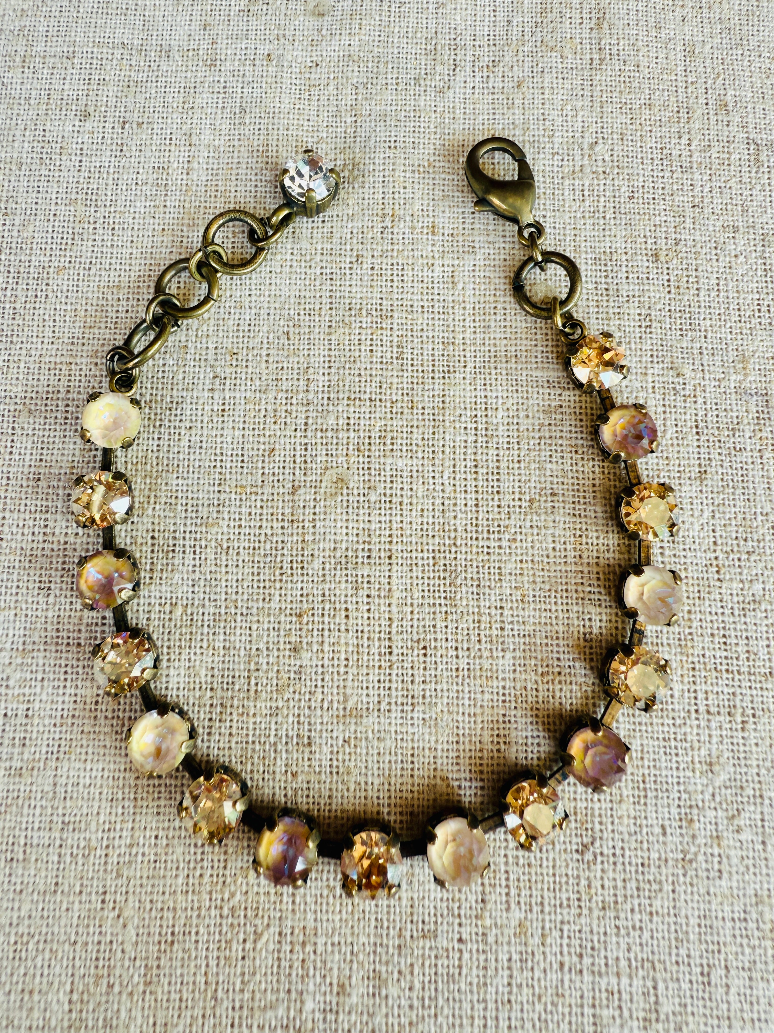 Neutral in color, but not in style! The Nya Bracelet features Australian crystals in rose gold and rose gold patina set in an antique gold finish. (Patina: splattered/speckled finish) Adjustable sizing between 7"-7.5", extender chain, logo disc, lobster clasp closure, and crystal end charm.