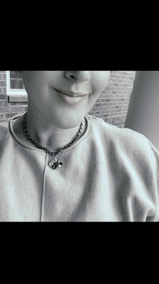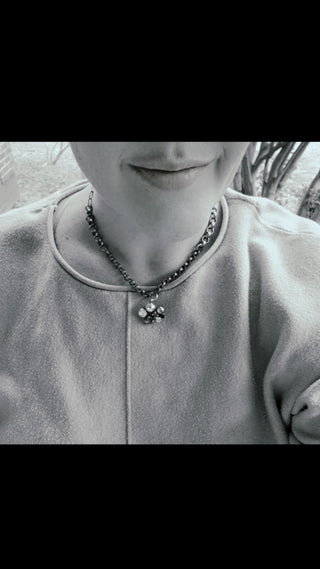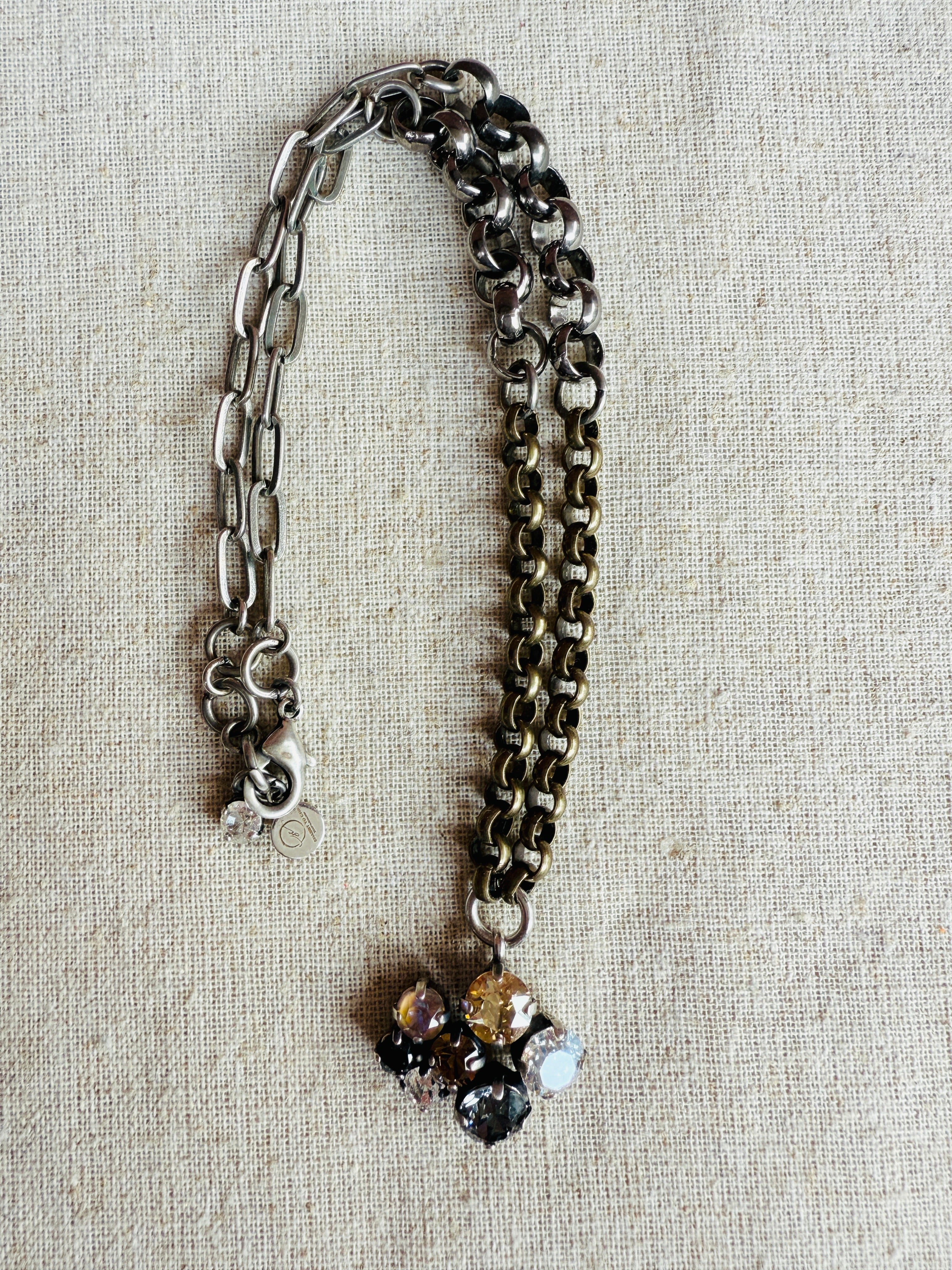 Why limit yourself to just gold or silver? Embrace the beauty of mixed metals with the Patricia necklace. Featuring three different chains in varying finishes, this pendant is sure to make a statement. The cluster of neutral-colored crystals adds a touch of elegance to any outfit. Trust us, this will be your go-to necklace!