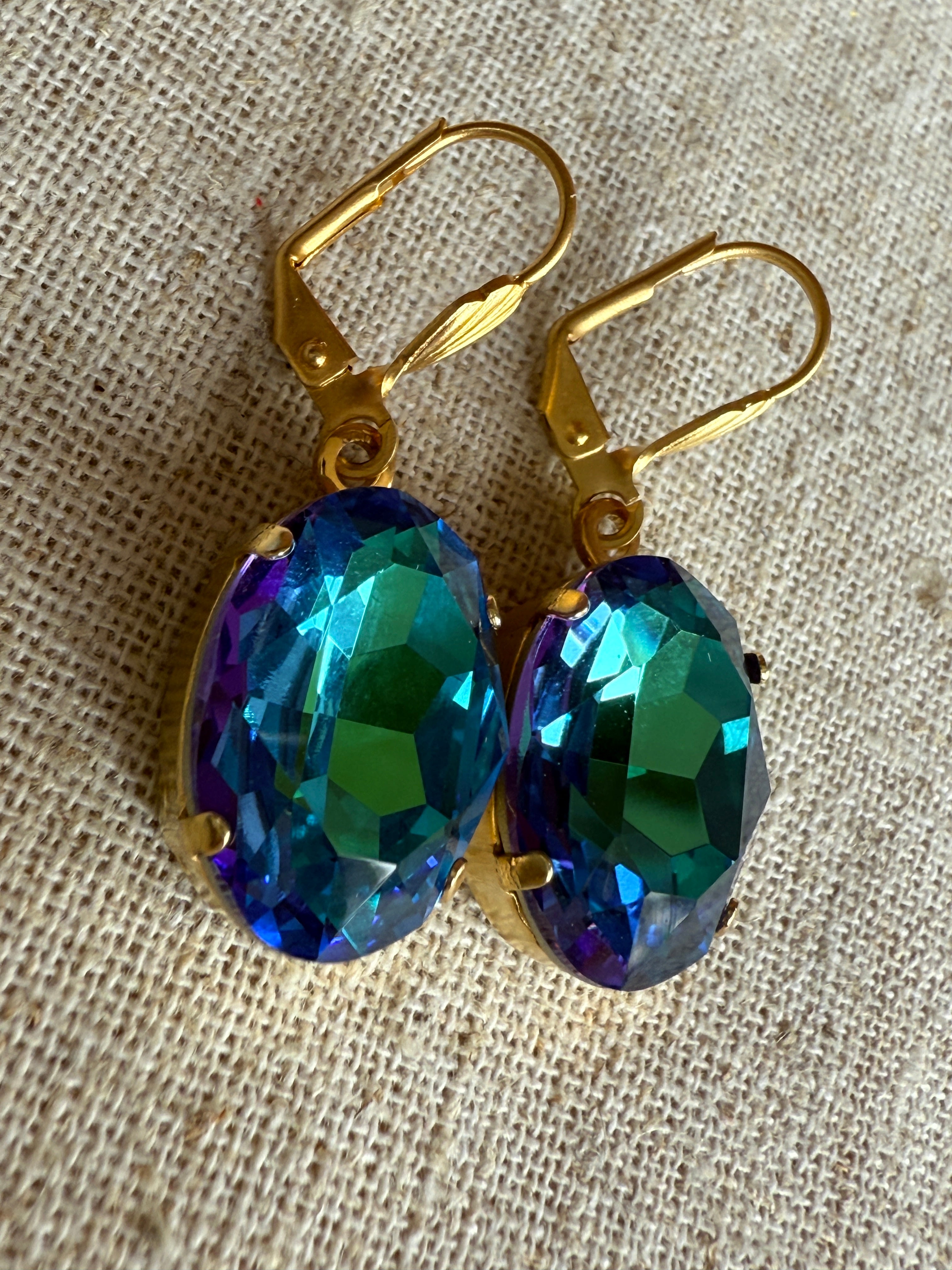 Indulge in the beauty of these Oval Cut Crystal Dangle Earrings, featuring a stunning set of shimmering faceted crystals arranged in a spectrum of blues and greens. The glamorous matte gold and lightweight design, along with the lead and nickel-free materials, make these earrings the perfect choice. With a secure lever back closure, you can confidently dance the night away.
