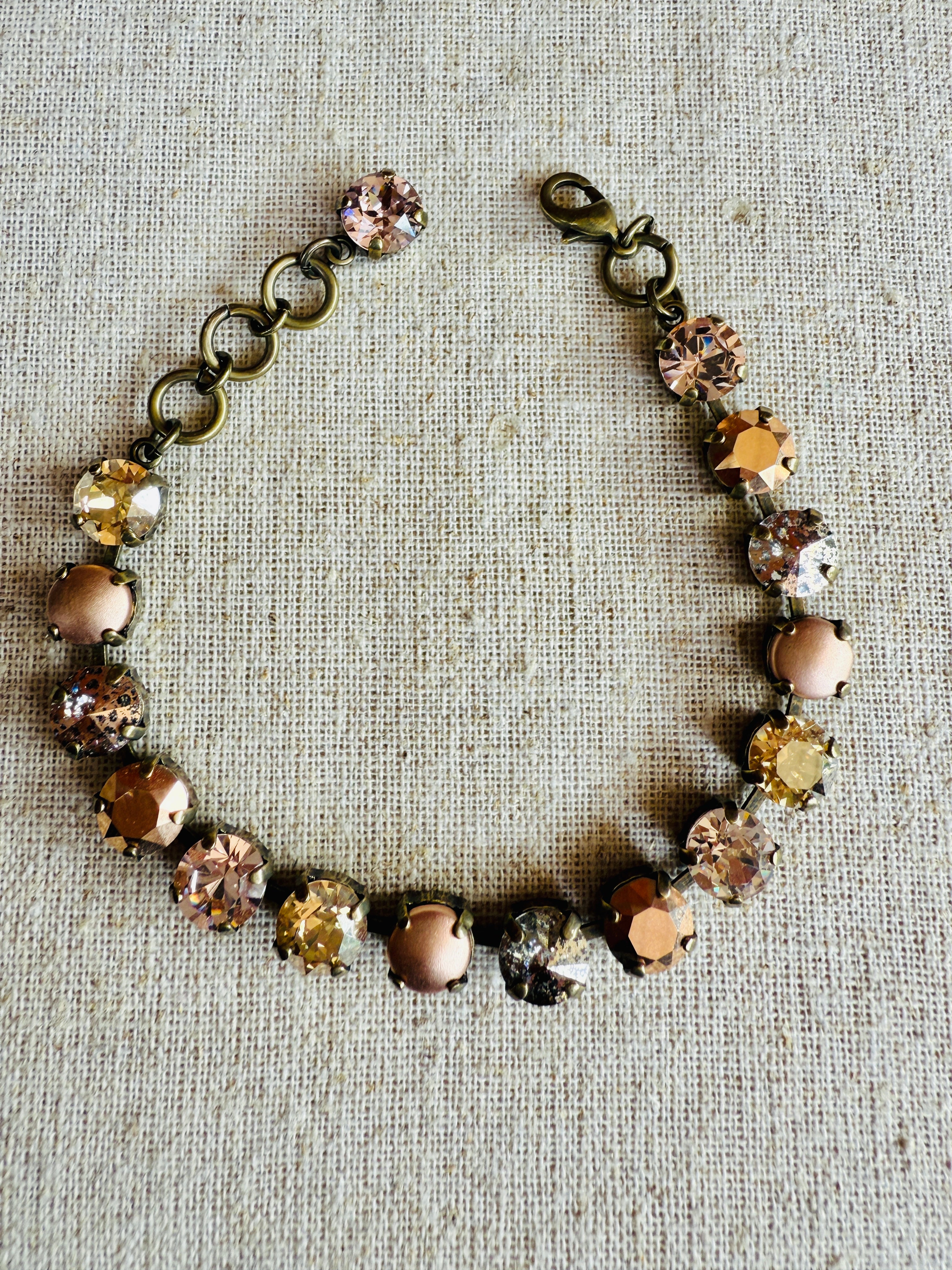 Experience the radiant beauty of Eliza Rose Gold Tennis Crystal Bracelet featuring warm shades of Australian crystals in antique gold finish. With a crystal tennis bracelet measuring 7" to 7.5", you can comfortably wear it all day, and it even comes with an extender chain, logo disc, lobster clasp claw, and crystal end charm.