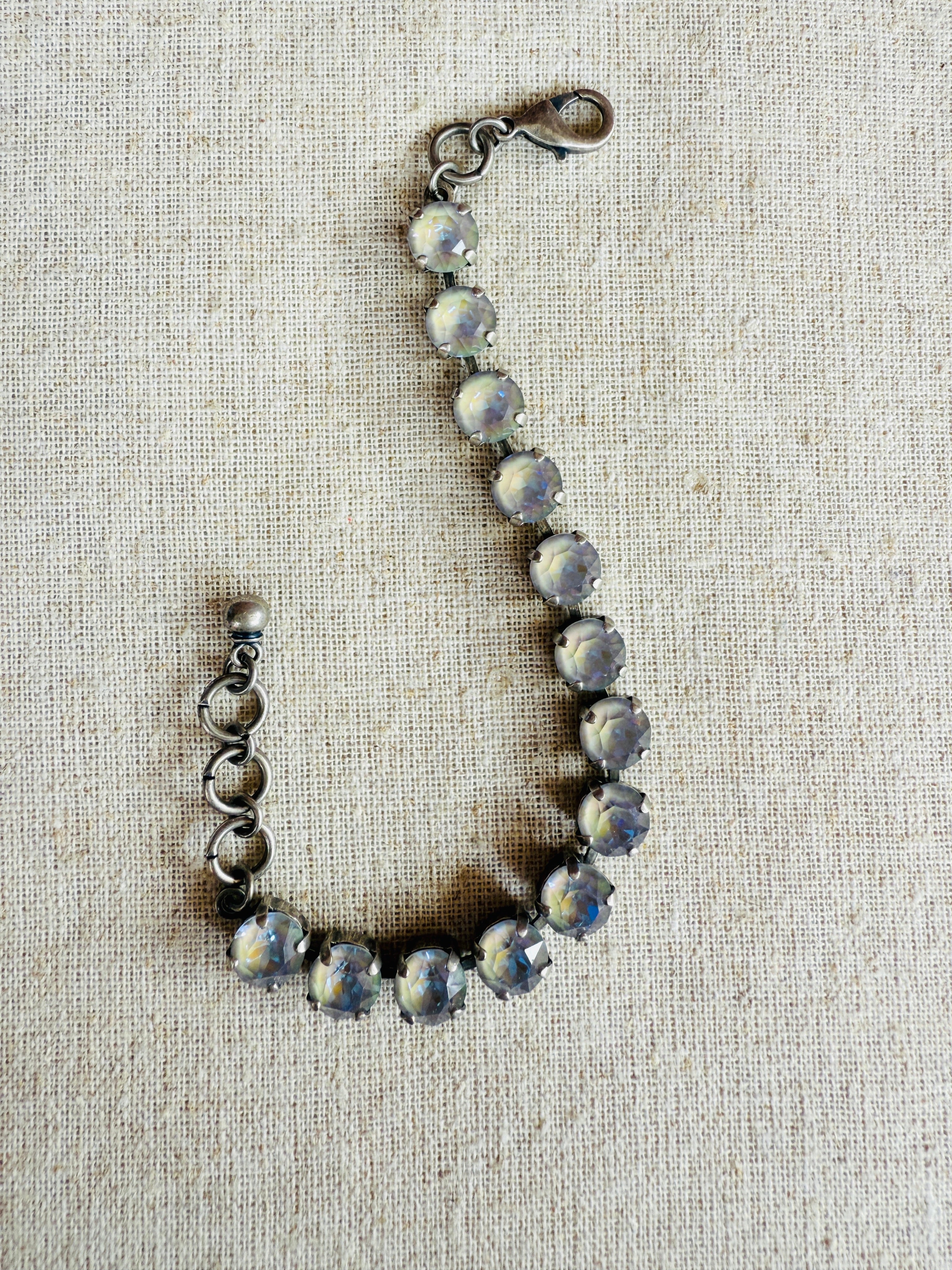 Taylor is subtle but packs lots of sparkle! High quality crystals that have a matte gray base and iridescent finish that highlights every facet. These are the delite series, it's more of a powdery soft sparkle, less intense than traditional crystals. We like to call it creamy sparkle. Set in an antique silver setting with a convenient lobster clasp, extender chain for custom sizing, and end charm.