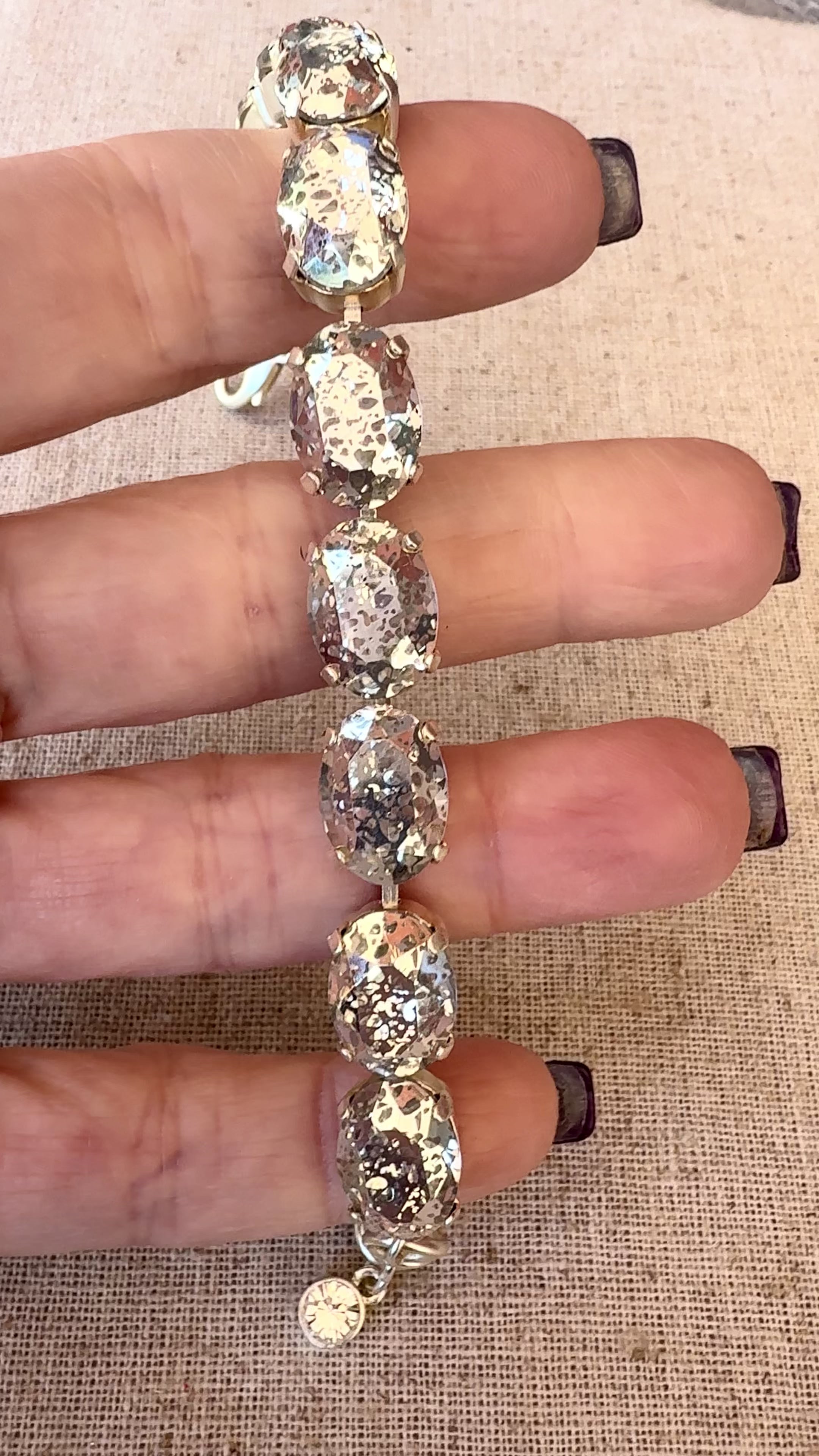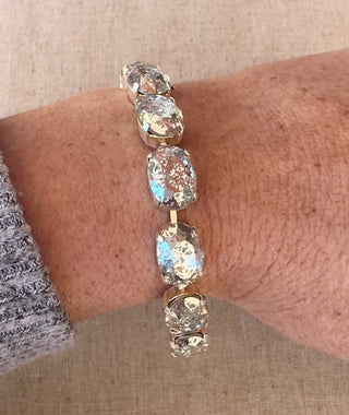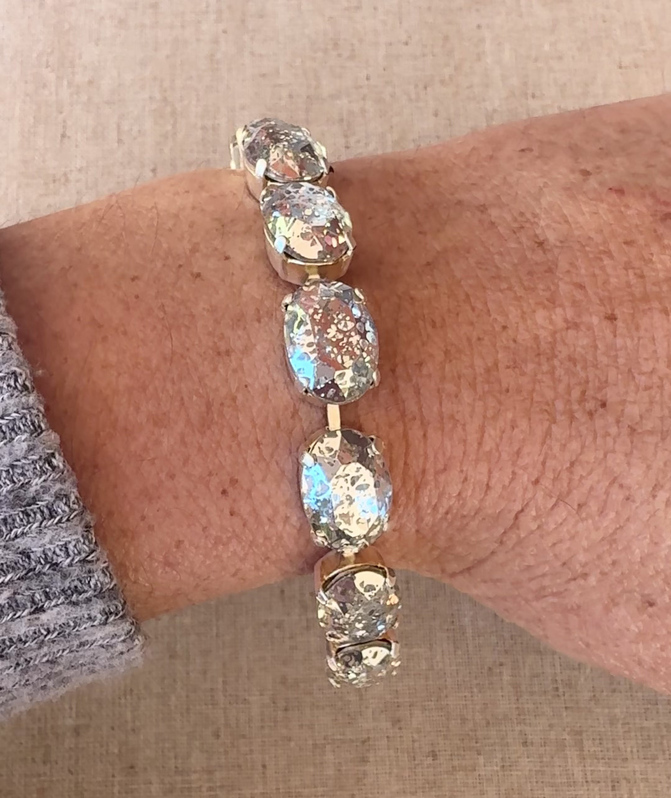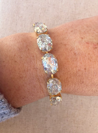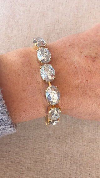 The Amanda is simple sparkle and sophistication all in one. Subtle enough for everyday wear or sparkly enough for date night. Patina finish crystals, matte gold finish.