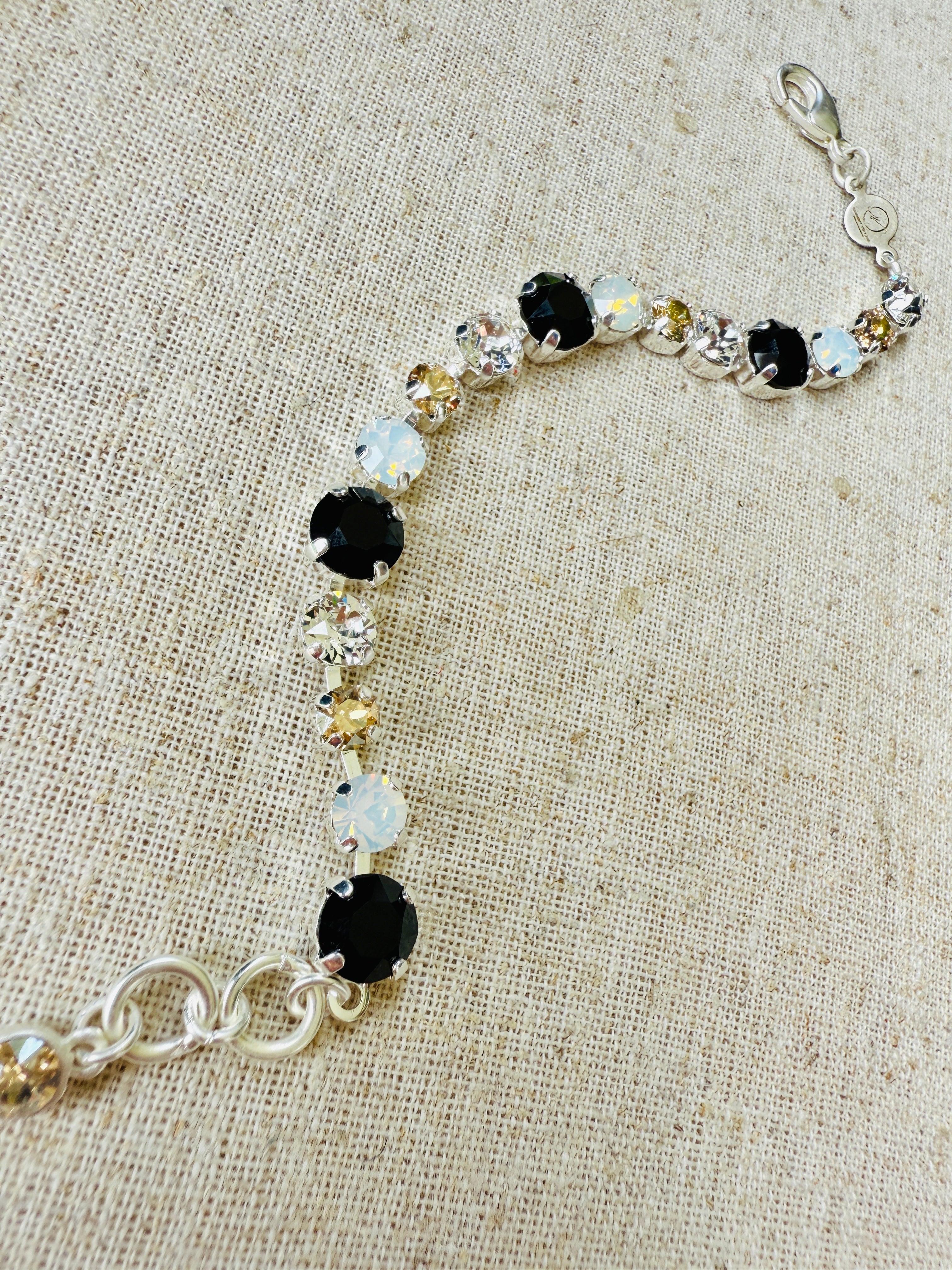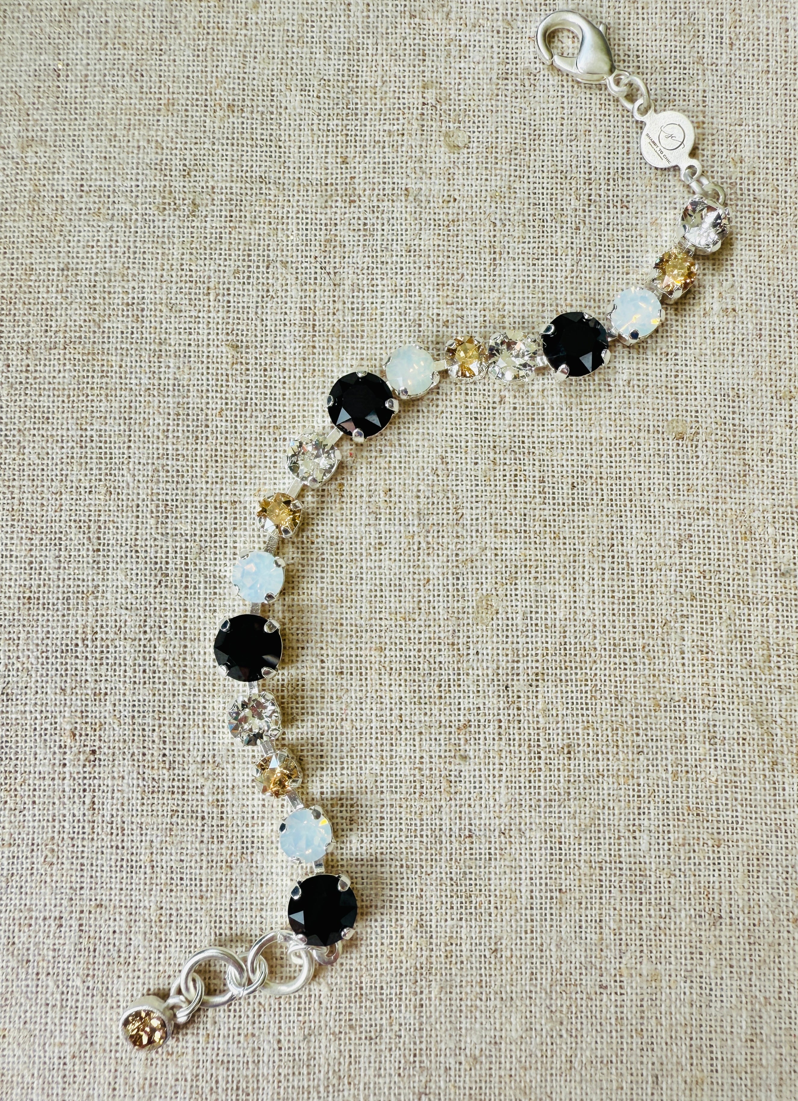 New Style! Our 3 most popular sizes in one sleek design. 8mm, 6mm, and 4mm in alternating neutral hues of onyx, white opal, clear, and gold champagne. Highest quality crystals guaranteed to deliver all the sparkle. Set in a bright shiny silver finish. The lobster claw clasp and extender chain provide a secure and adjustable fit, while the crystal end charm adds a touch of extra sparkle. Adjustable from 7”-7.5”